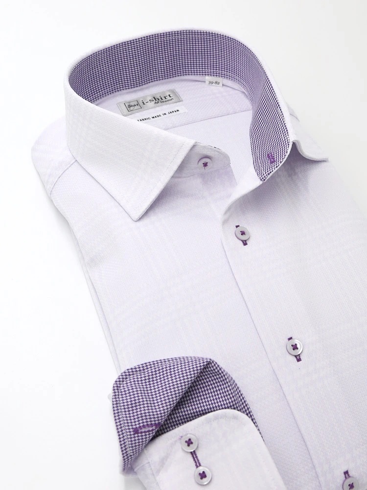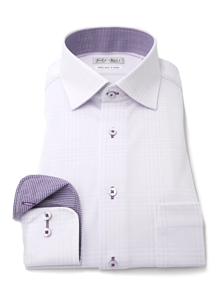 【完全ノーアイロン】長袖 アイシャツ セミワイド【ジャガードシリーズ】グレンチェック調 ワイシャツ i-shirt 通年(ラベンダー)