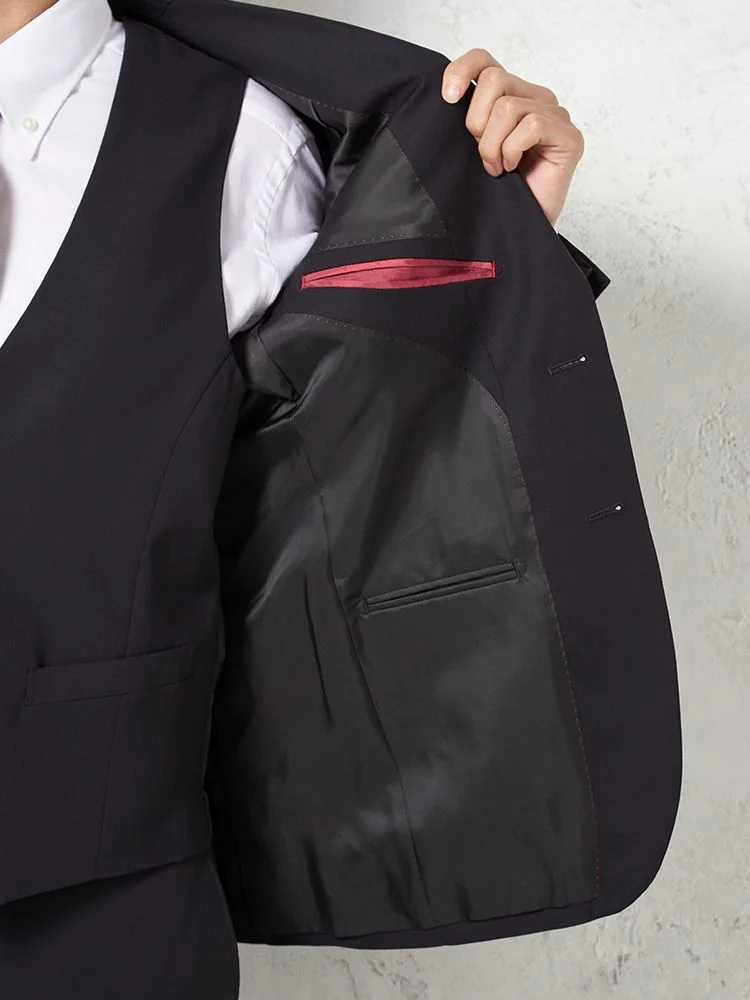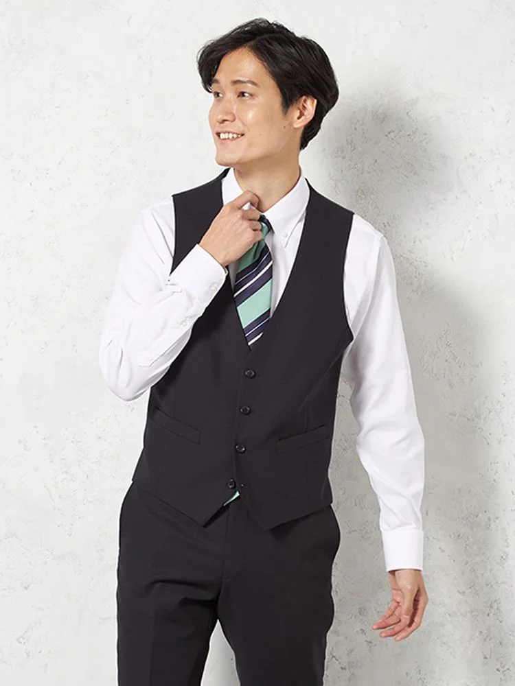 ジャケット、パンツ、ベストの3点セットで、スーツ全体を簡単にコーディネートできます。ビジネスやフォーマルな場面に最適です。