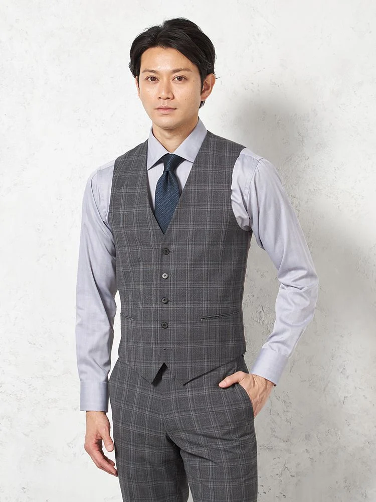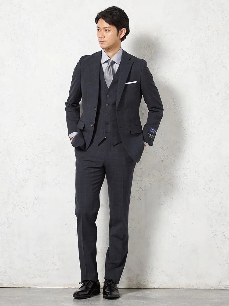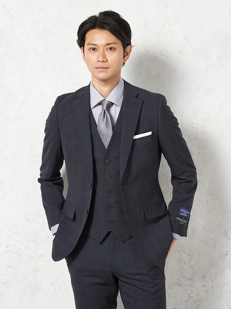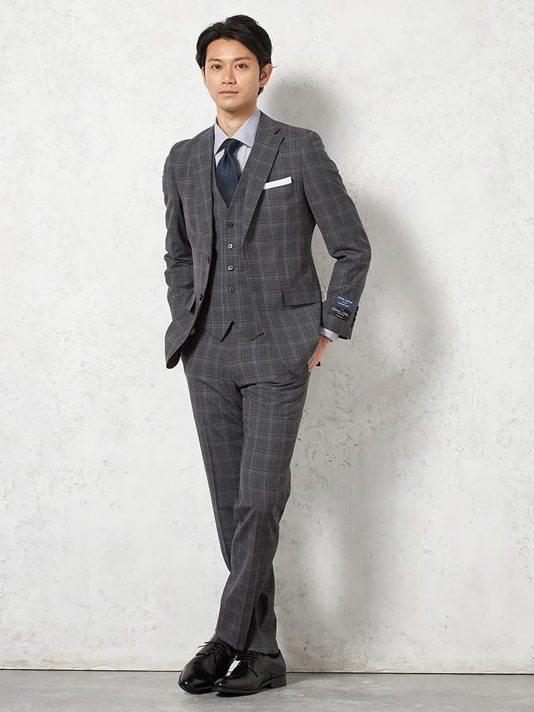 シックなチェック柄がクラシカルな3ピーススーツ。