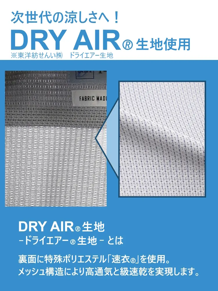 東洋紡せんい(株) DRY AIR(R) 生地を使用し、肌にあたる面をメッシュ構造にしています。肌面がメッシュとなるため生地と肌の接地面が少なく、べとつきを軽減させる効能もあります。
