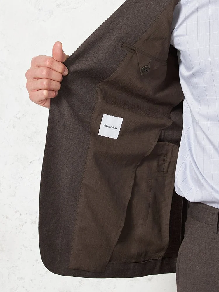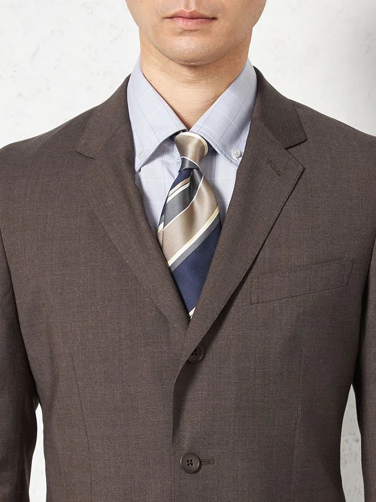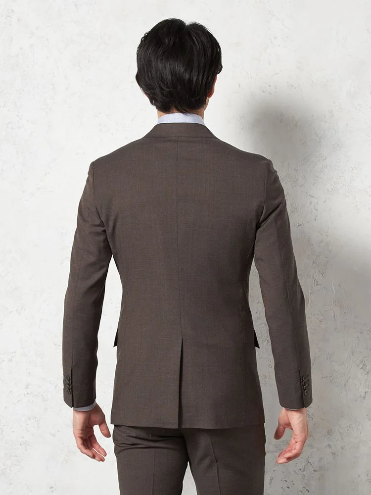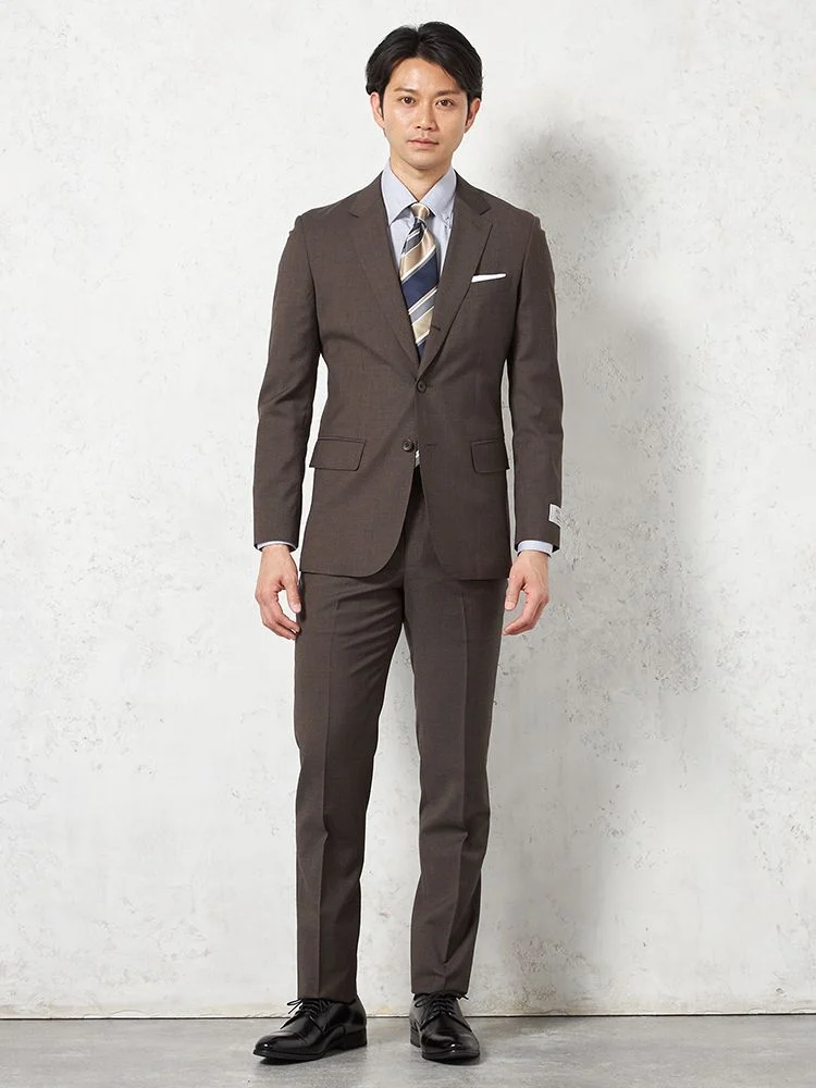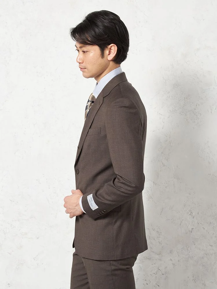 落ち着きのあるブラウンが大人の風格を漂わせる、スリムシルエットのスーツ。