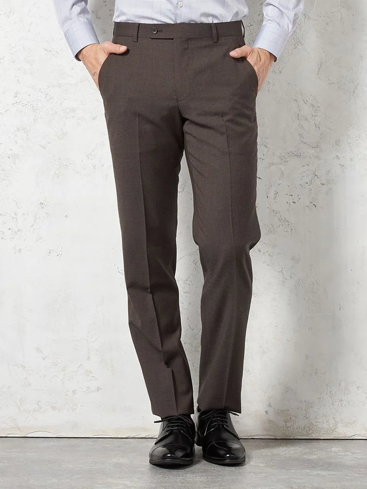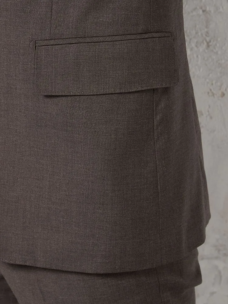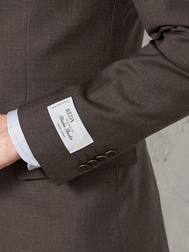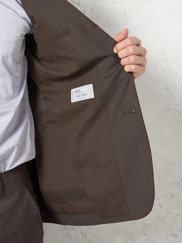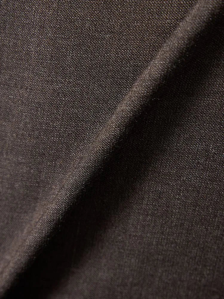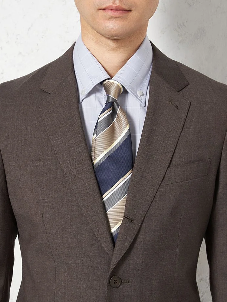 落ち着きのあるブラウンが大人の風格を漂わせる、スリムシルエットのスーツ。
