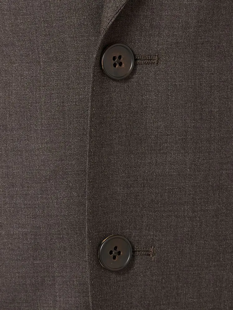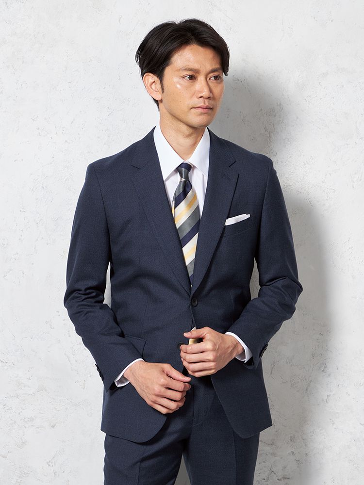 前立ての開き具合を調整できる段返り3釦仕様で、ベーシックなノッチドラペルを組み合わせました。
