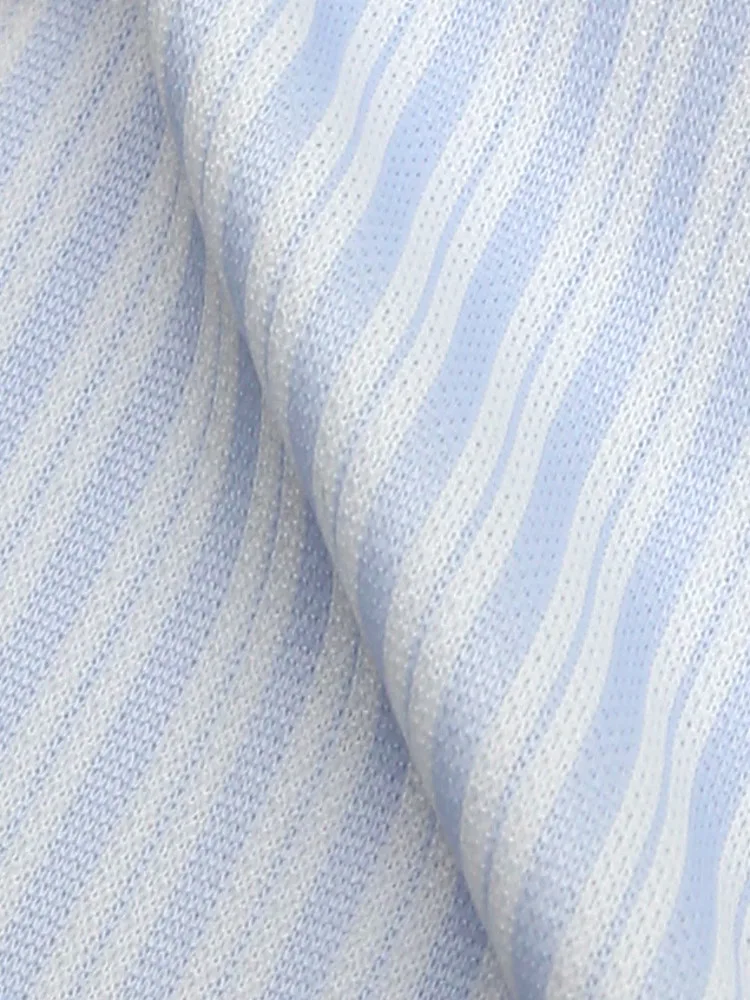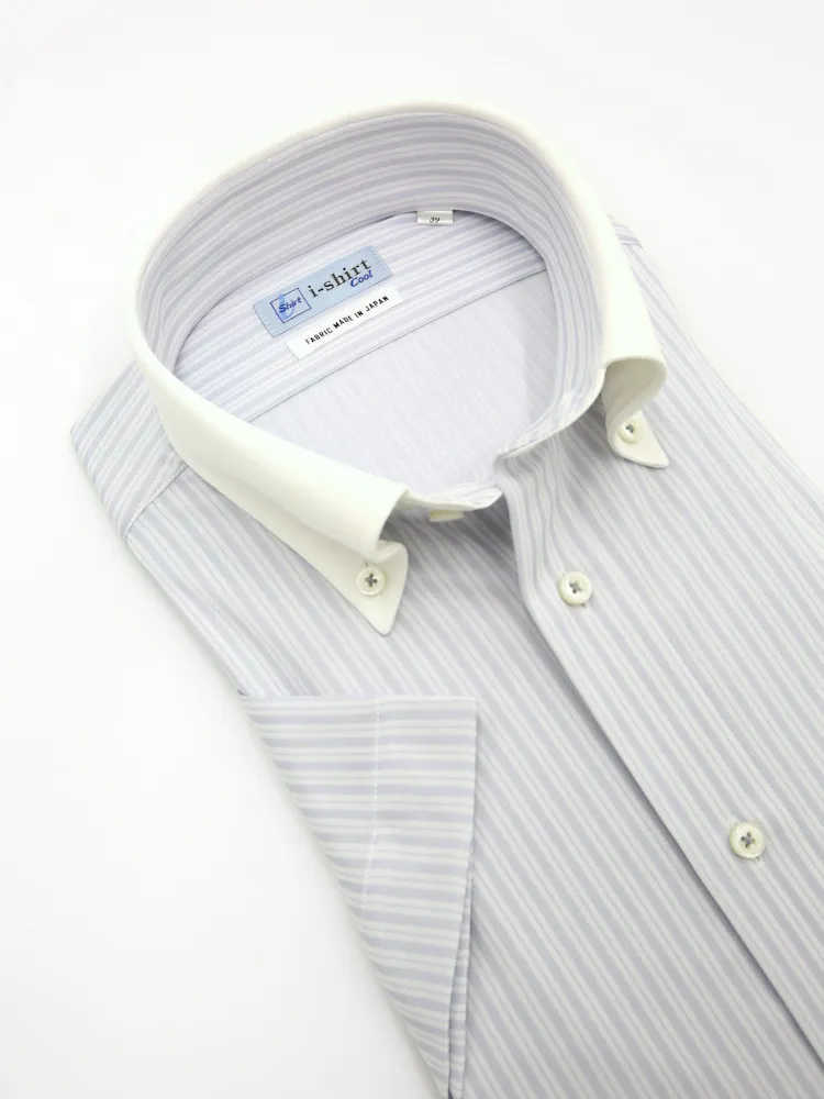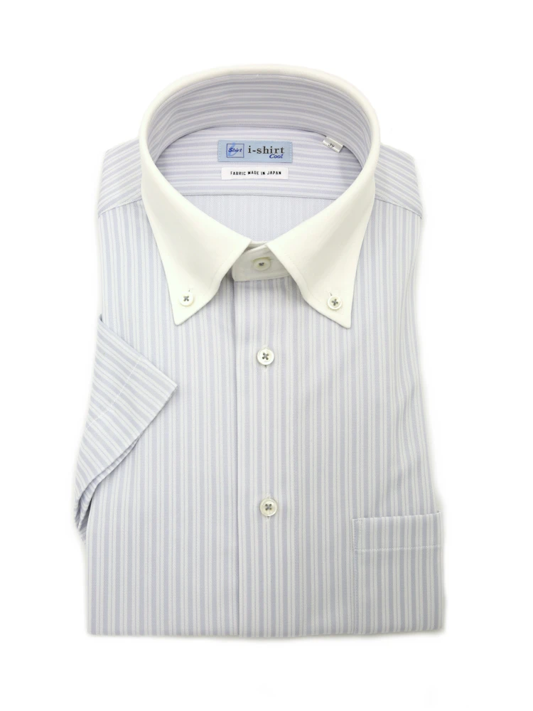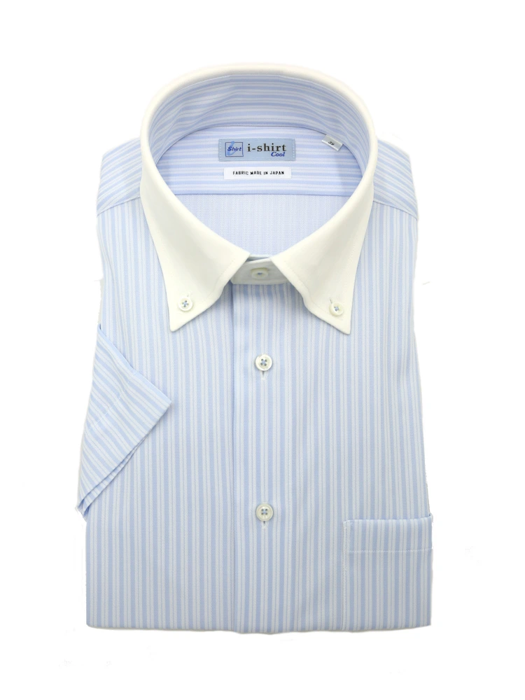 【完全ノーアイロン】半袖 アイシャツ ボタンダウン【バイオセンサークール生地使用】高通気 冷感 ストライプ ワイシャツ i-shirt 春夏(サックス)