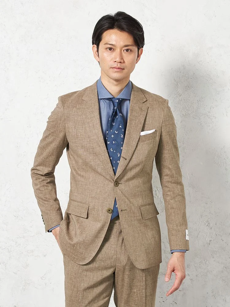 【パンツウォッシャブル】スーツ段返り3つボタン尾州素材麻混ライトフィールストレッチ織柄無地リッケンバッカー春夏