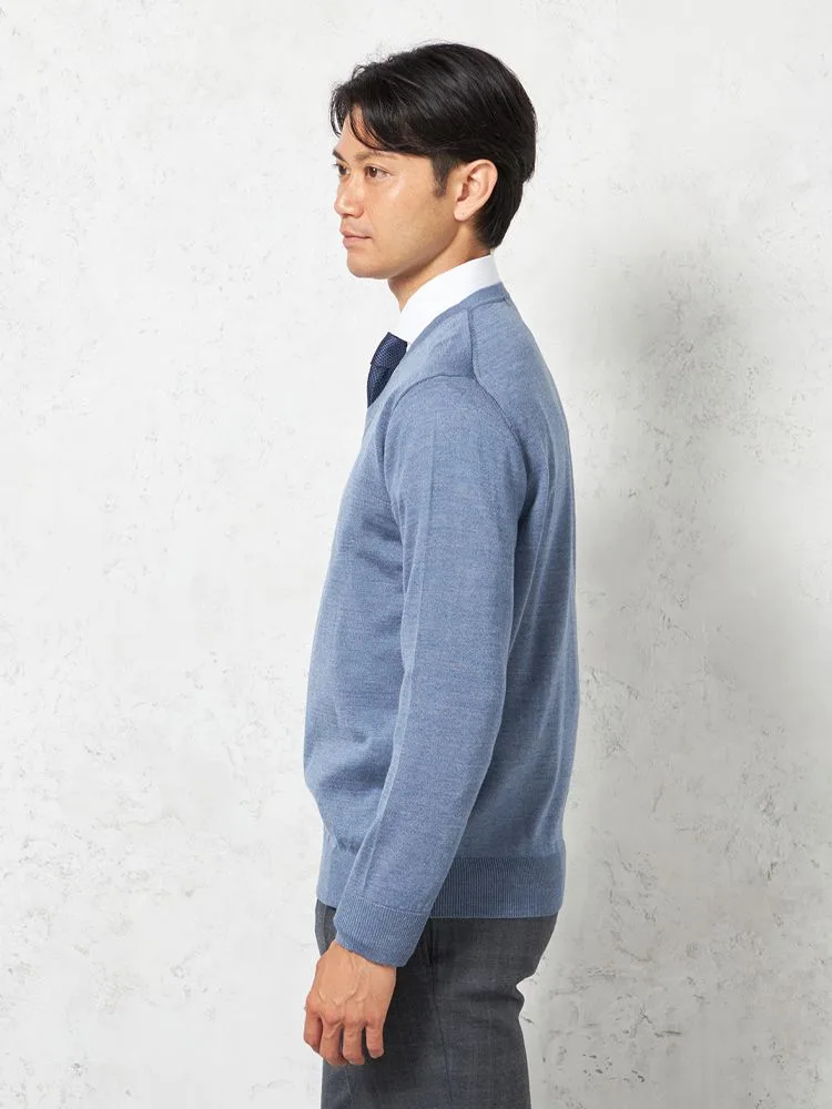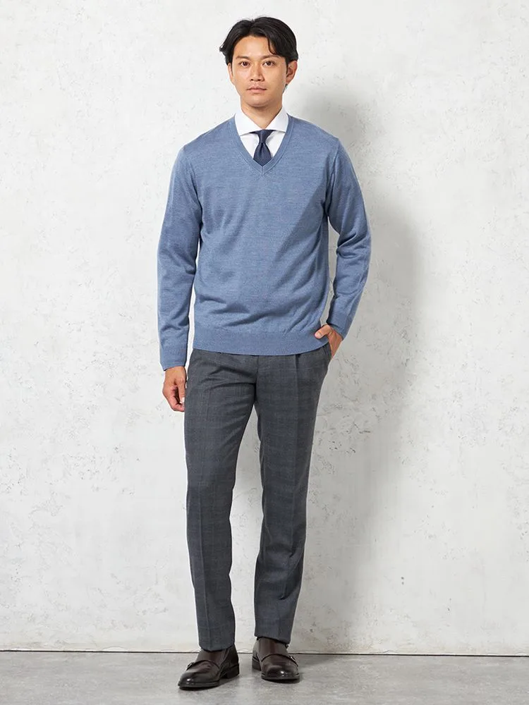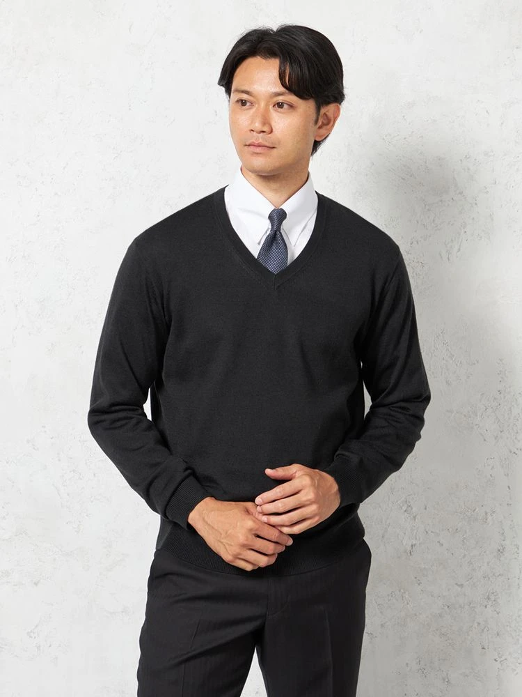着回し力の高いベーシックな無地天竺Vネックセーターです。