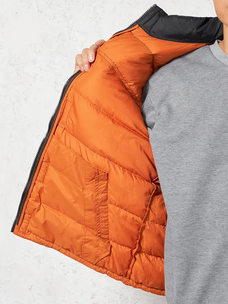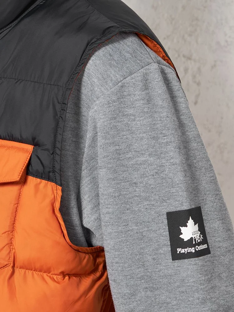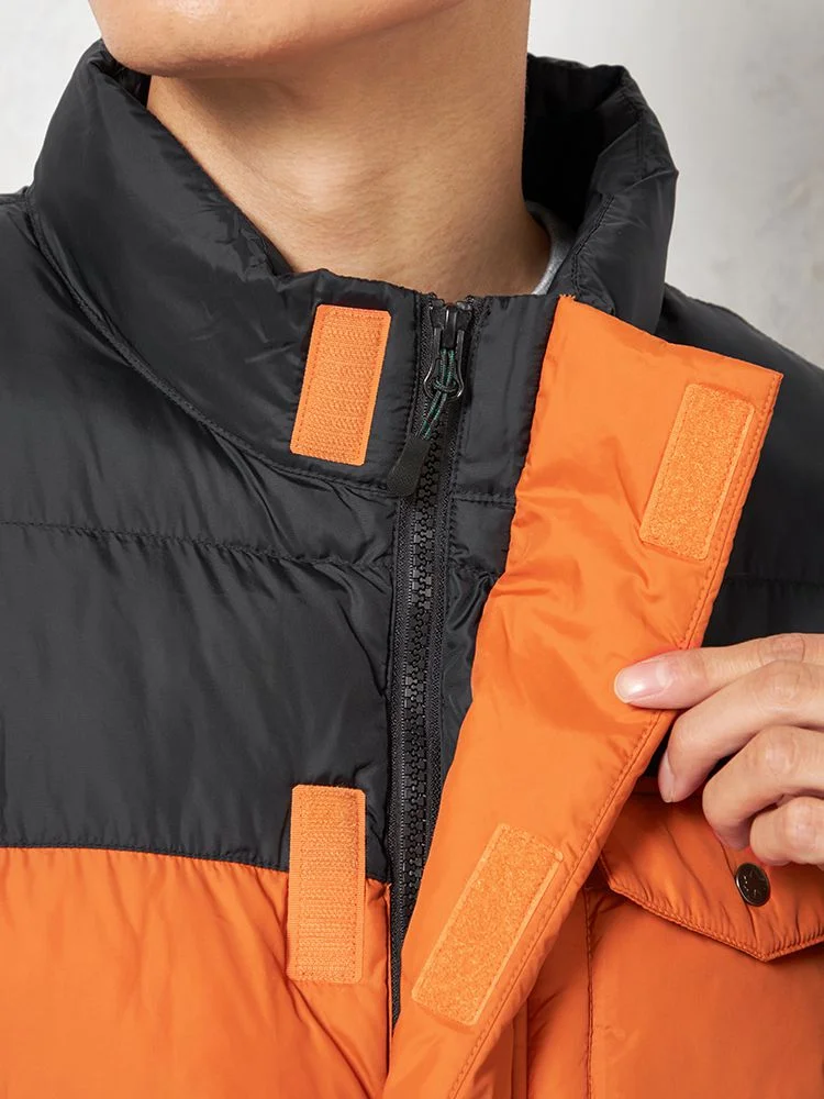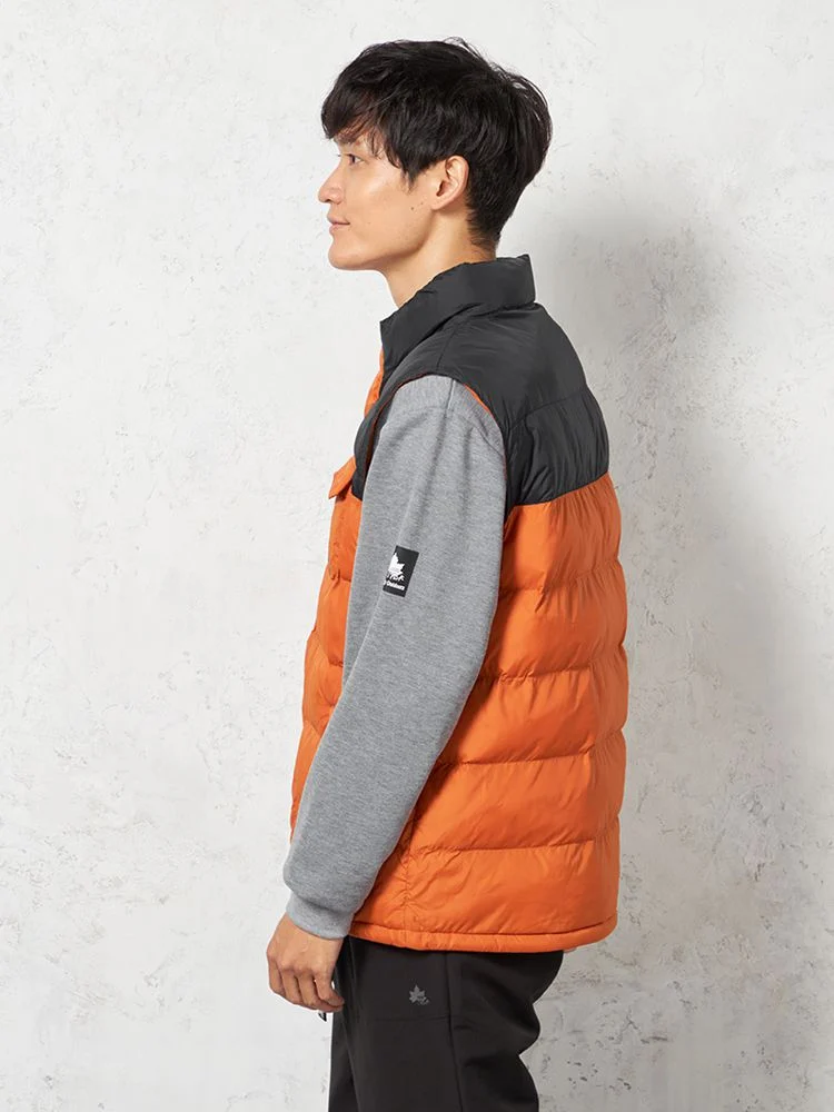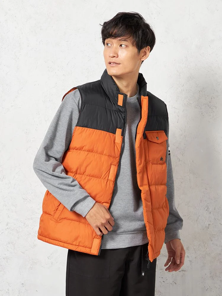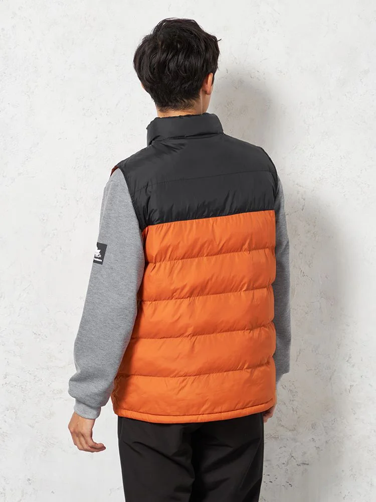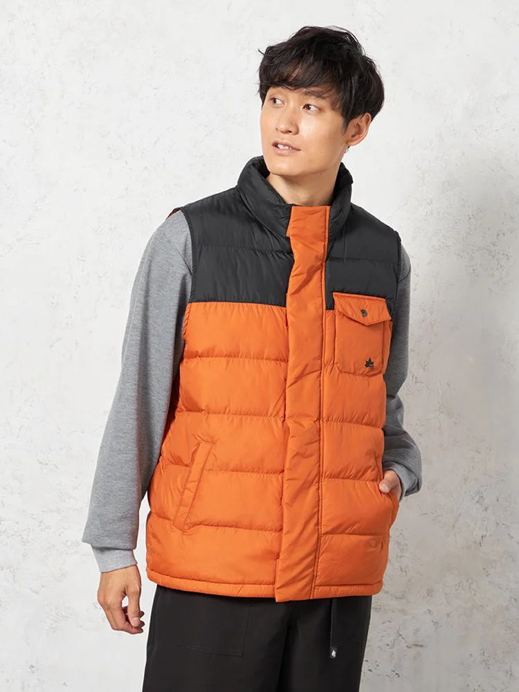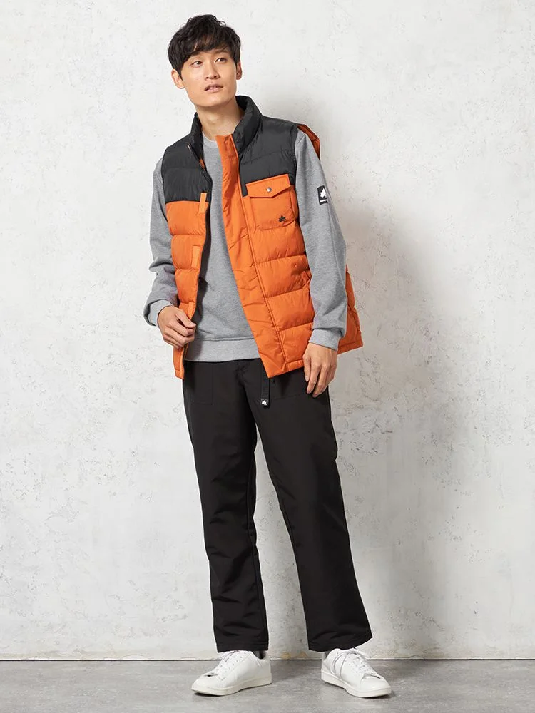 配色の切り替えデザインが着こなしのアクセントになる中綿ベスト。