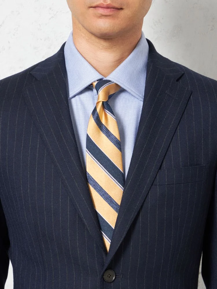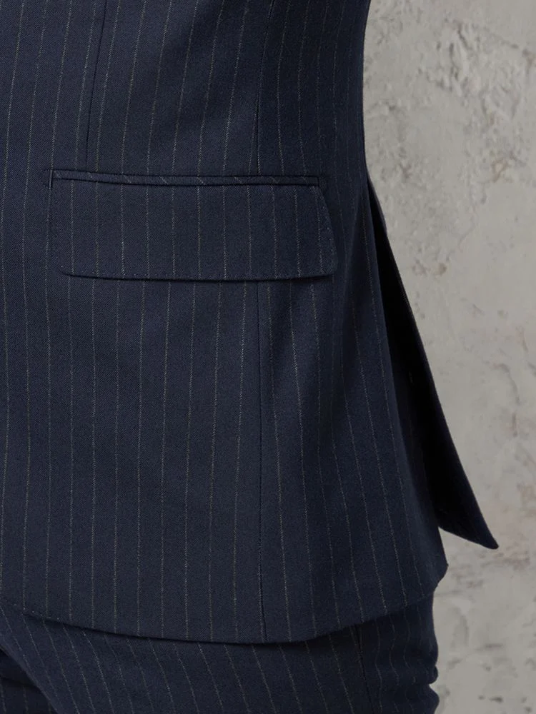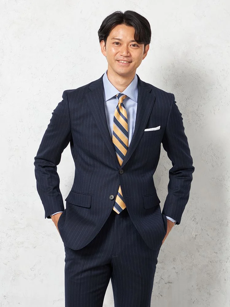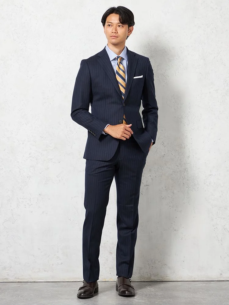 格式と華やぎを併せ持つ英国調ストライプデザインのウールスーツ。