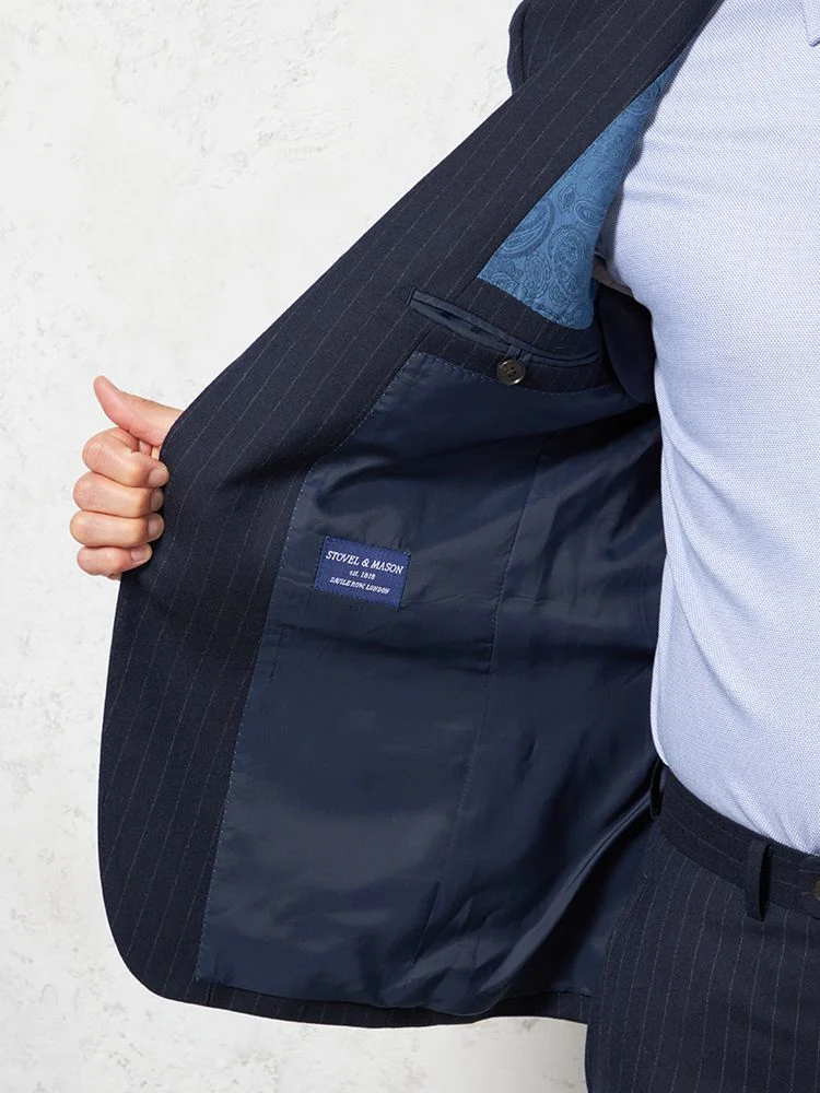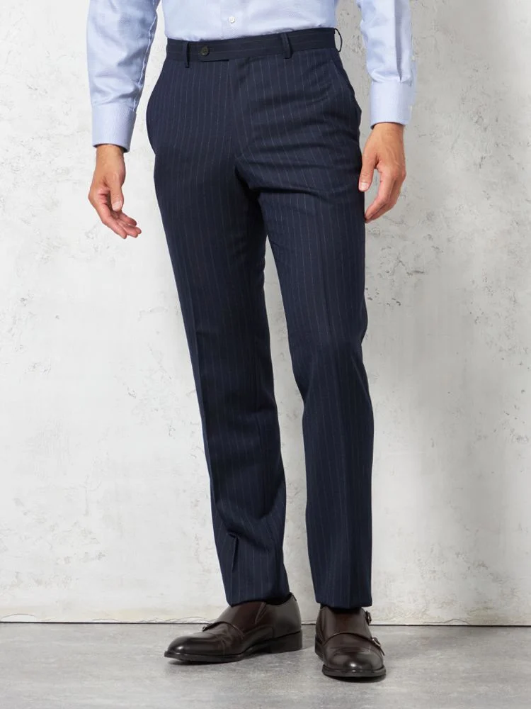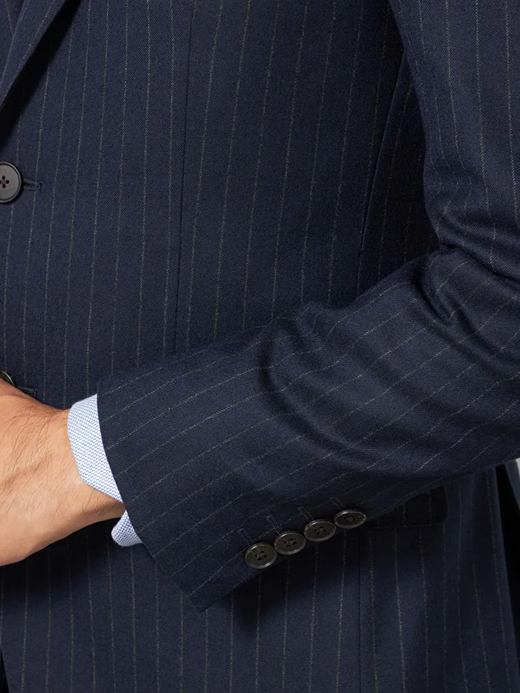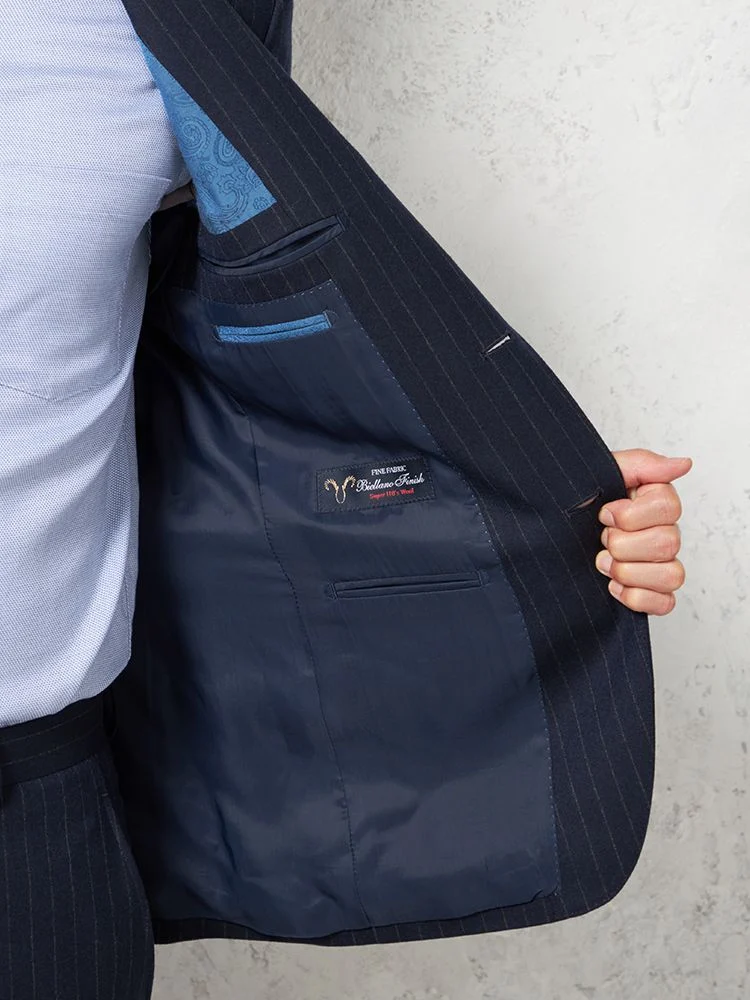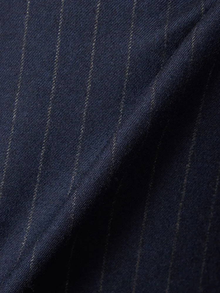 格式と華やぎを併せ持つ英国調ストライプデザインのウールスーツ。