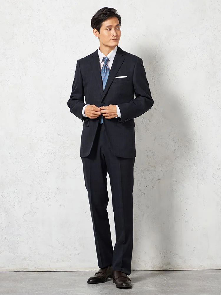 【即納】スーツ 2つボタン【WEB限定】上下ウォッシャブル チェック ネイビー 通年