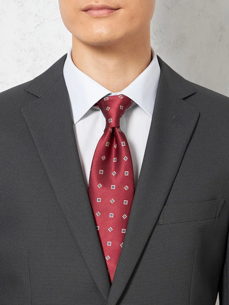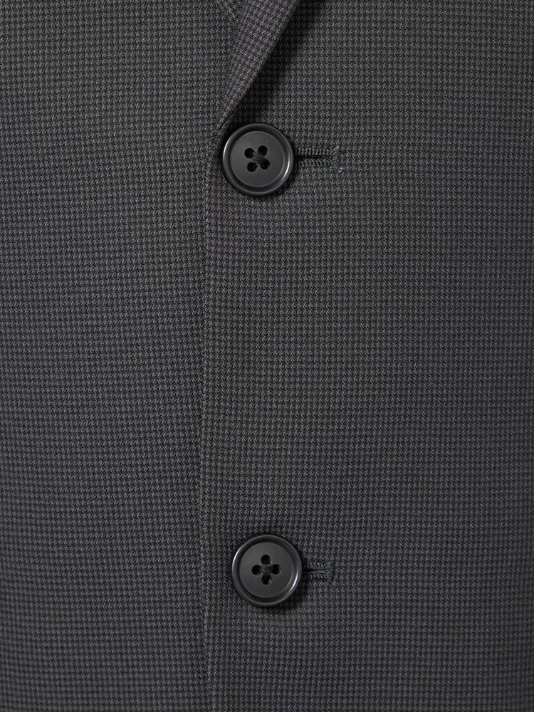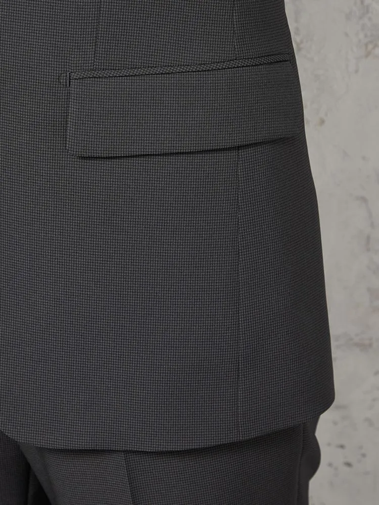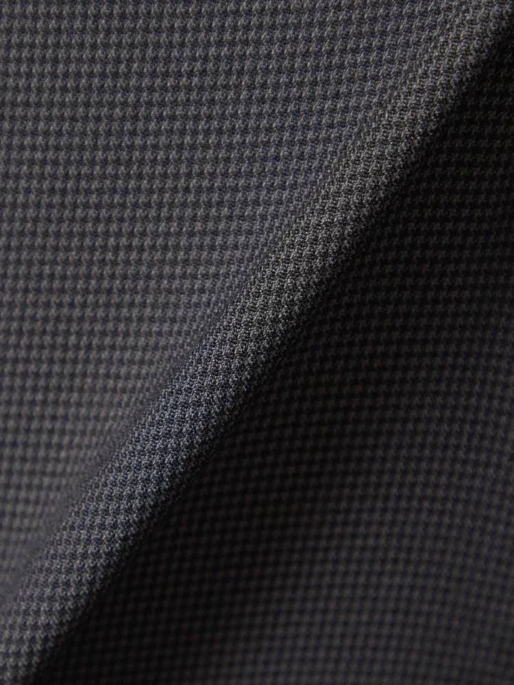 一見すると無地、よく見ると細密な千鳥格子柄になった生地に趣きのあるスーツ。明るすぎないグレーカラーが知的で落ち着いた印象を与えます。