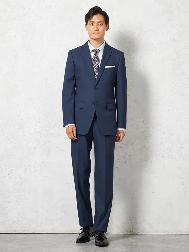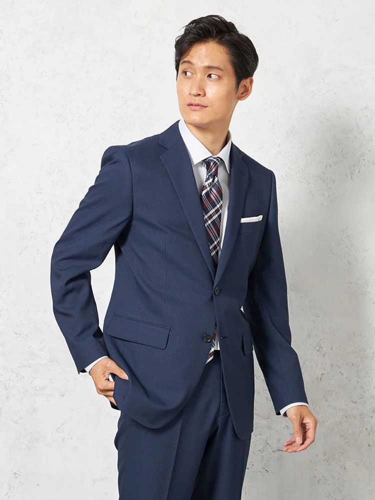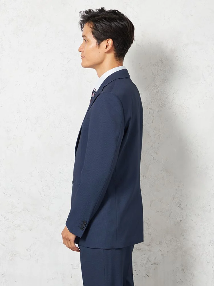 ネイビーと黒の二色使いによって織られた生地に趣きのあるスーツ。明るすぎない深みのあるカラーはシャツ・ネクタイも合わせやすく幅広いコーデが楽しめます。
