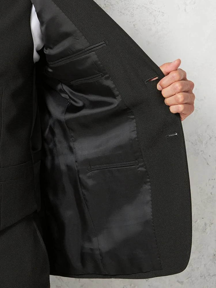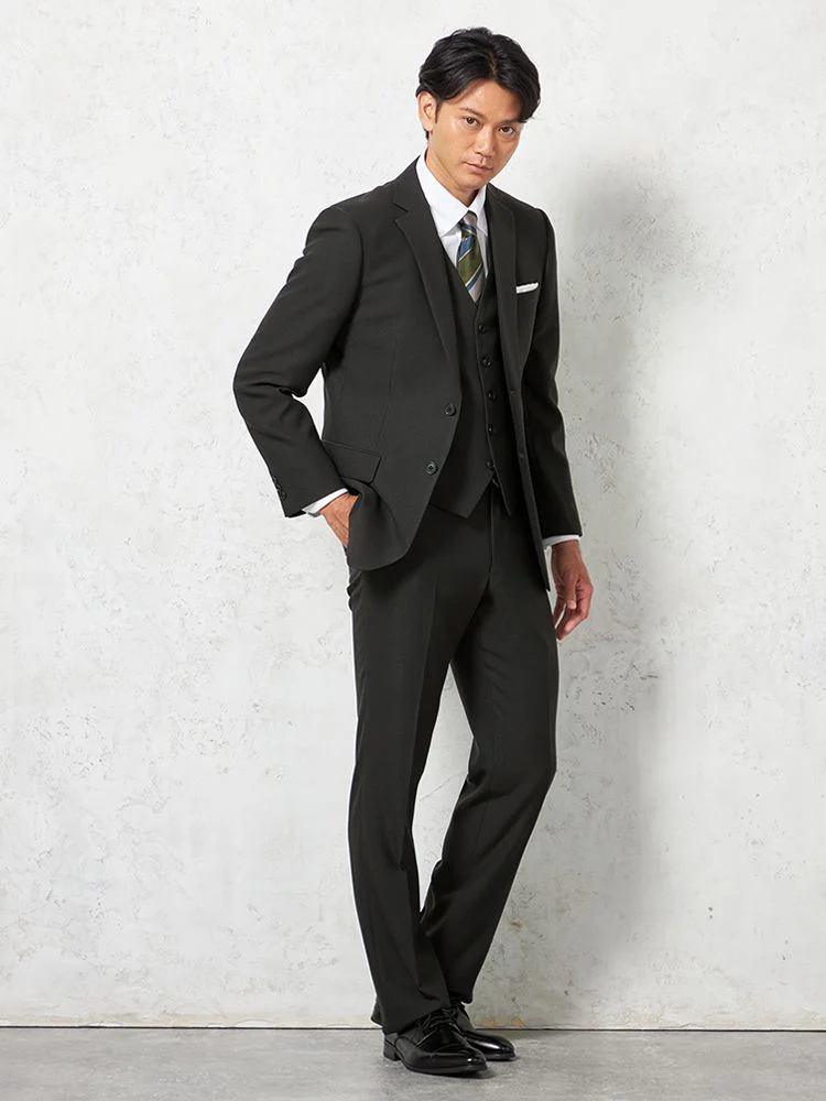 シックな印象のブラックのスリーピーススーツ。プレーンなデザインは年代問わず汎用性高くお使いいただけます。