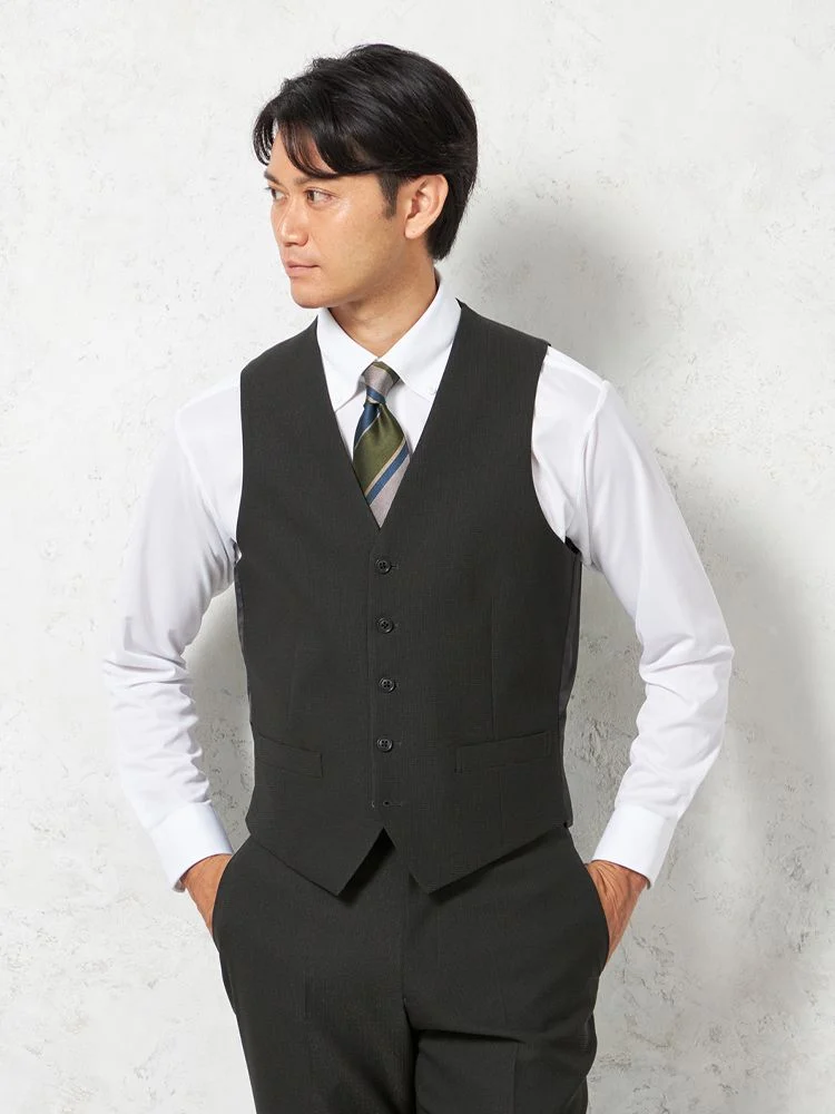 ジャケット、パンツ、ベストの3点セットで、スーツ全体を簡単にコーディネートできます。ビジネスやフォーマルな場面に最適です。