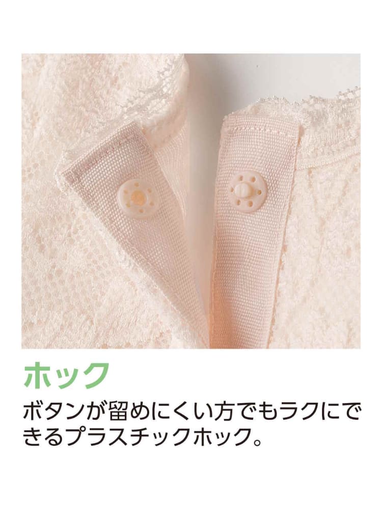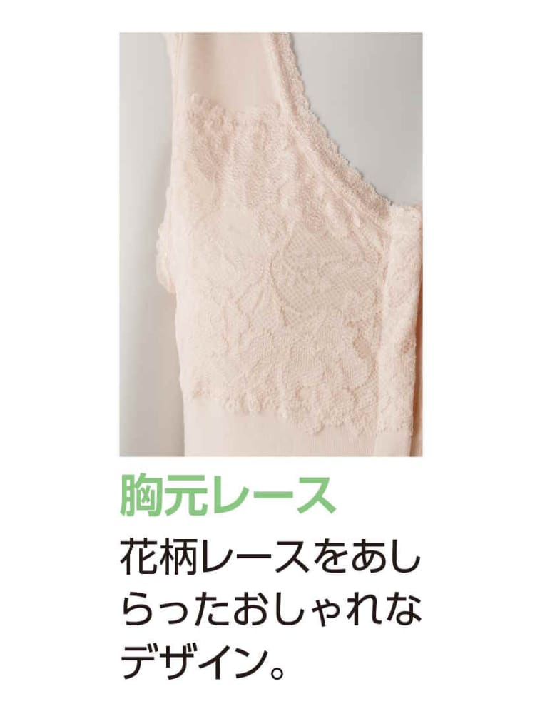 「おしゃれを楽しみたいシニア」に! おしゃれをするなら、まずは市下着から気分を上げていきたい。そんなシニアのためのエレガントスタイルインナーです。 胸元に幅広の花柄レースをあしらったエレガンスなホックインナーは、洋服に響きにくい、落ち着いたベーシックなカラー展開。お肌に優しい綿100%も嬉しい。?