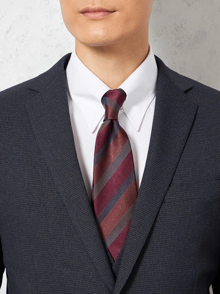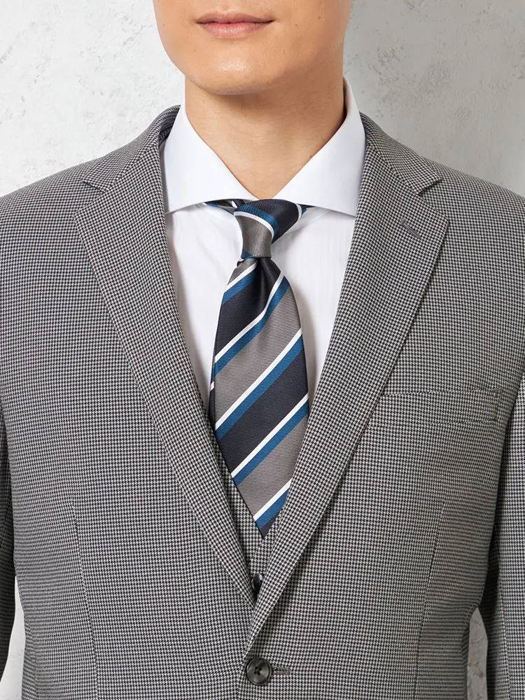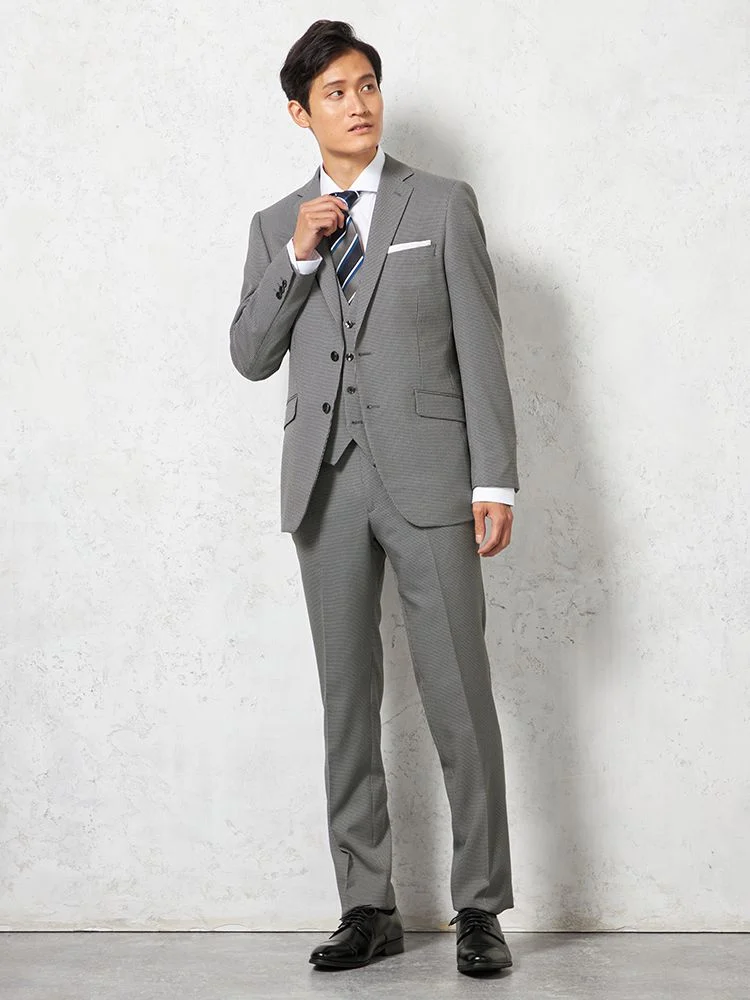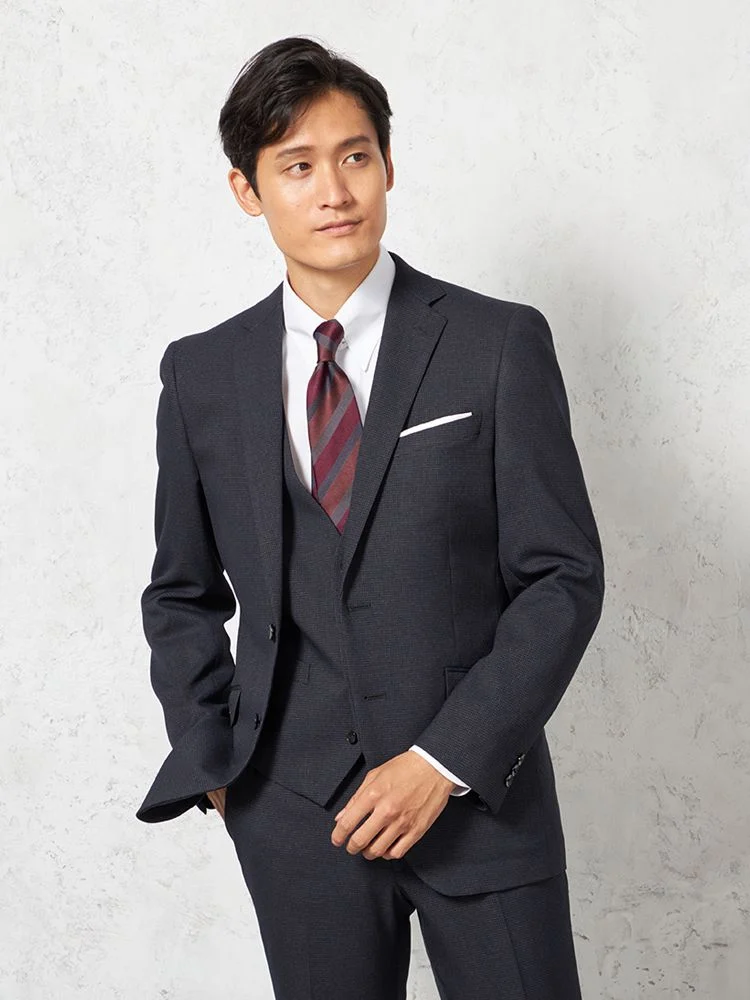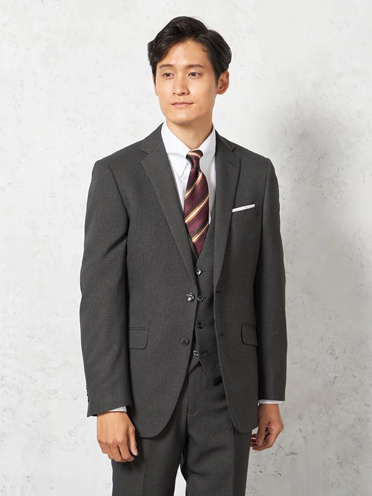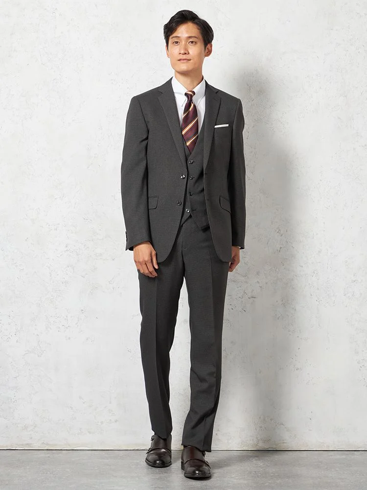 ウールタッチのストレッチ性のある柔らかなポリエステル100%素材使用したスリーピーススーツです。