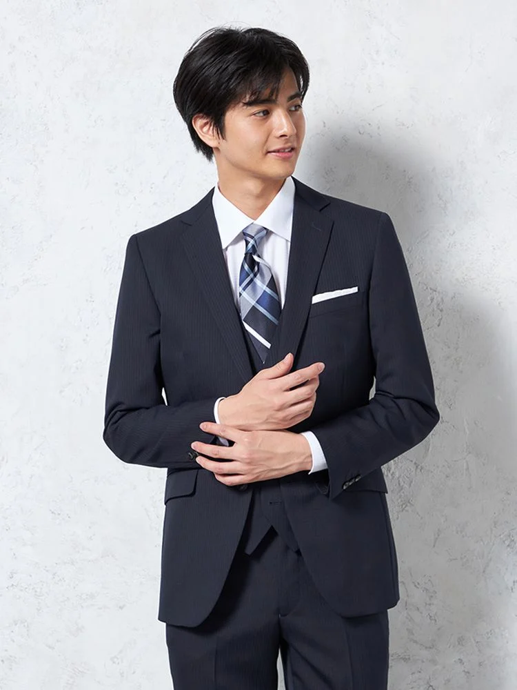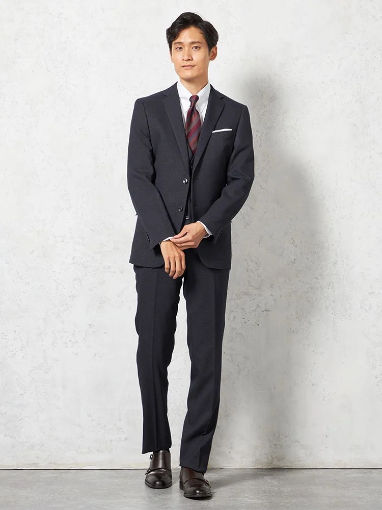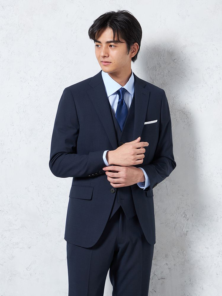 【即納】スリーピーススーツ2つボタン【WEB限定】ウールライク小柄ネイビー秋冬