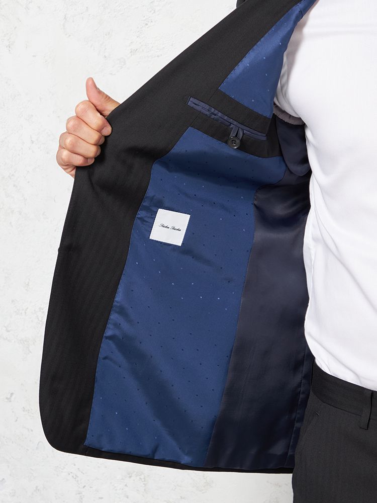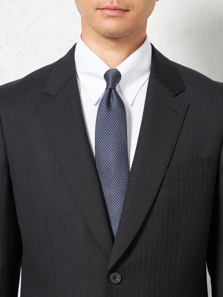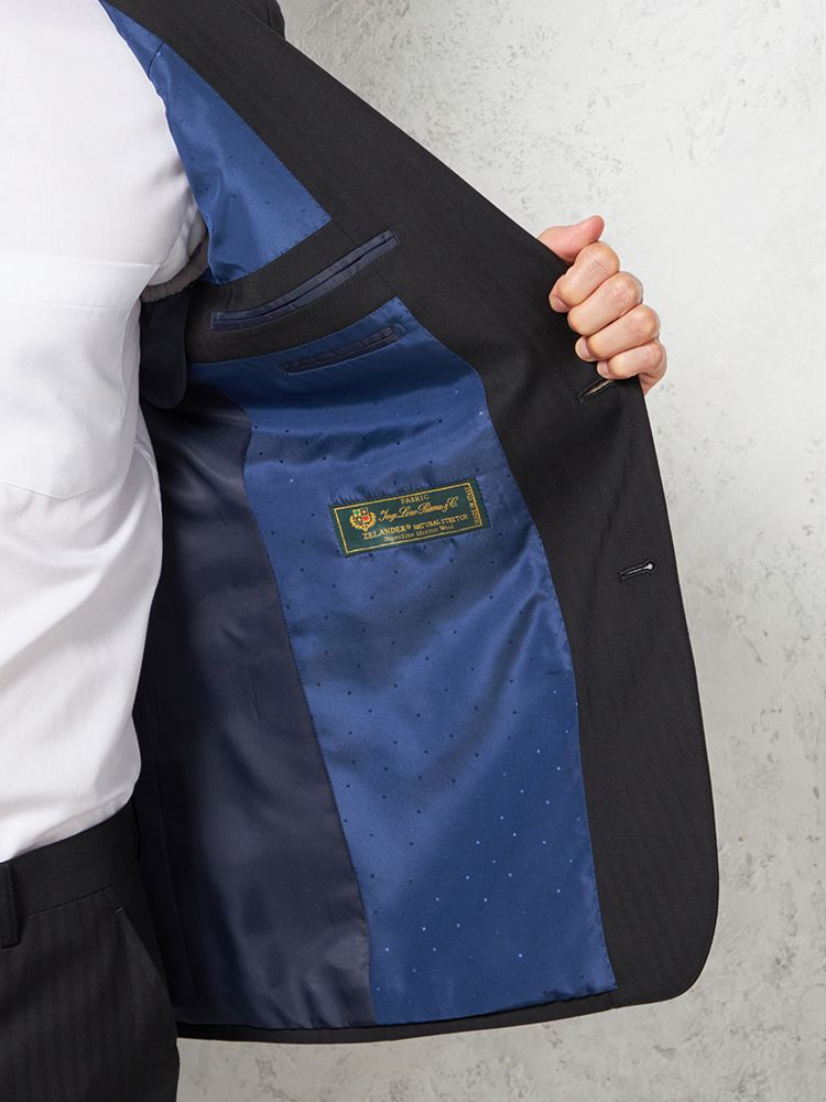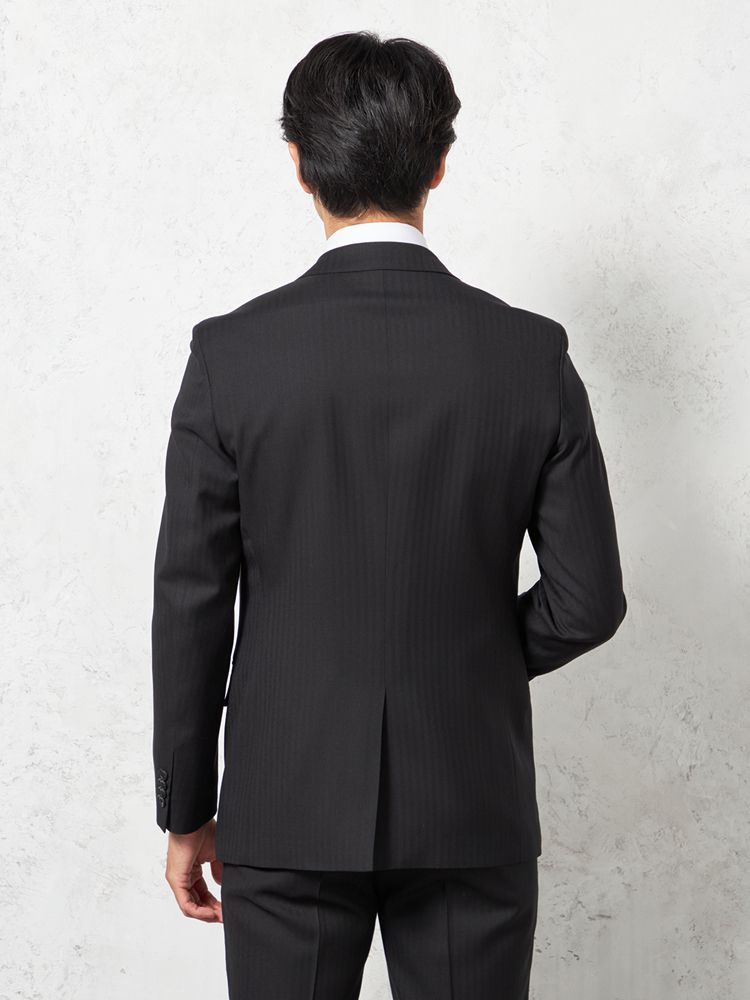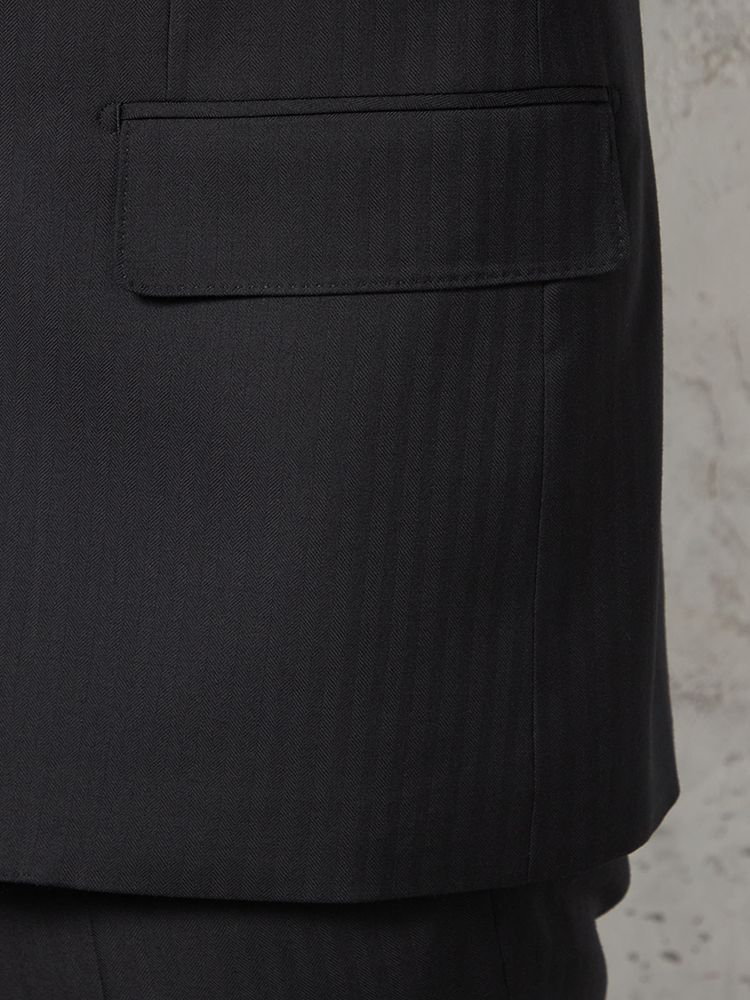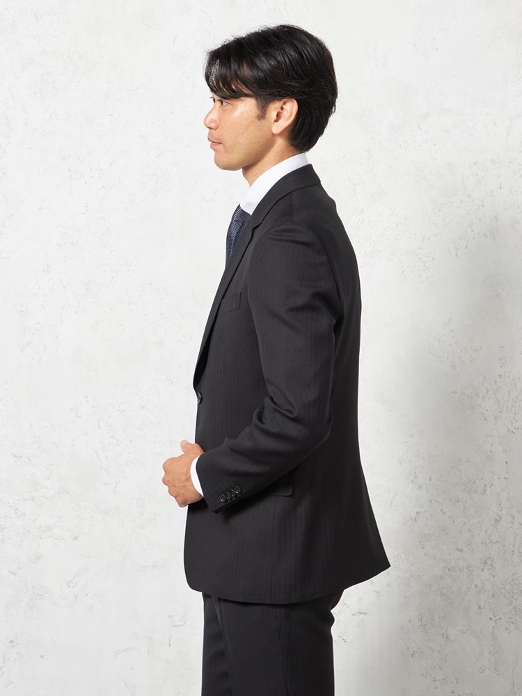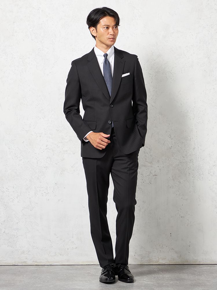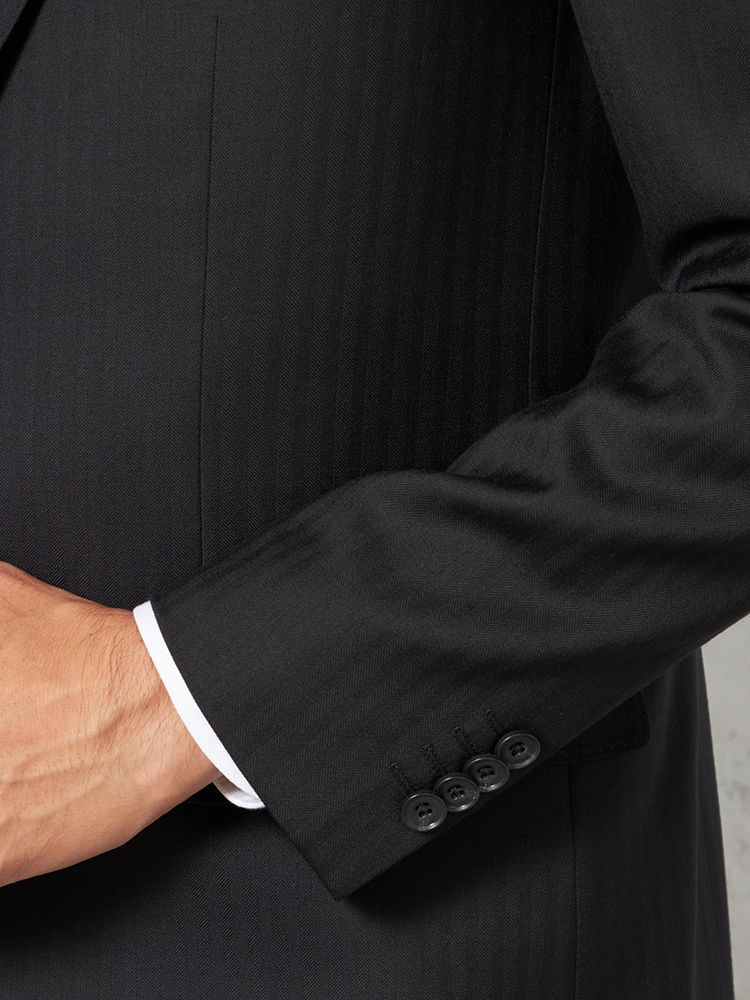 単色ながらもヘリンボーンの織地で格調高く仕上げたデザインは遠目にはストライプ柄に見えるため、シャープな着こなしを楽しめます。