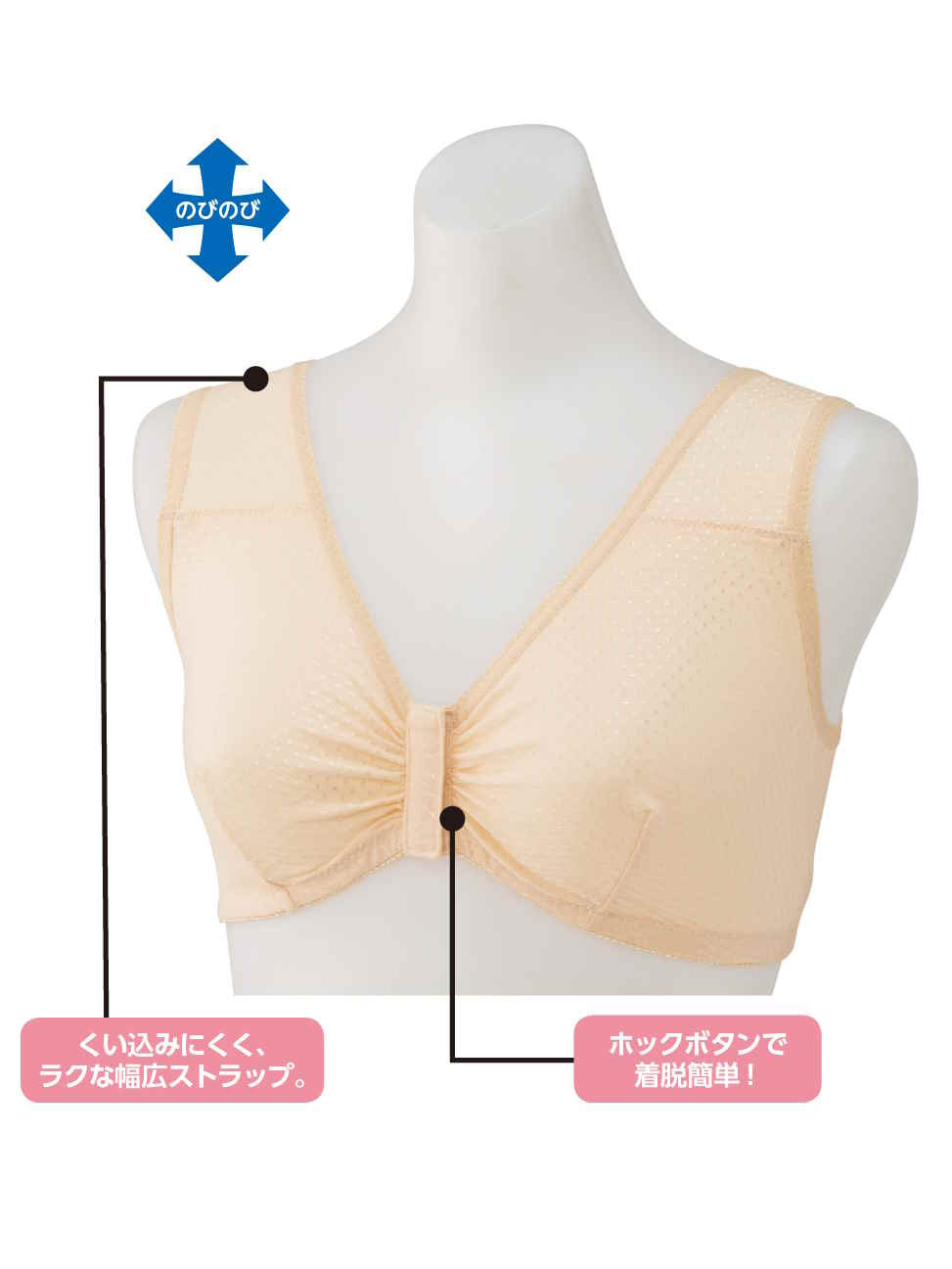 【特徴1】フロントボタン、幅広の肩ストラップで着やすさ抜群