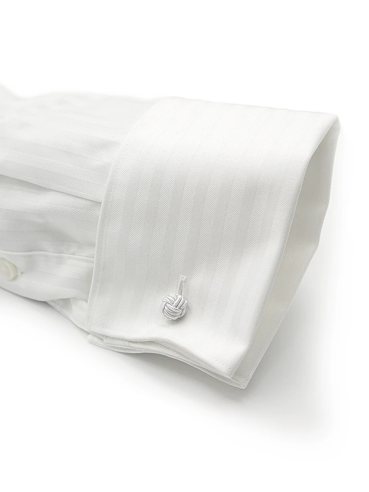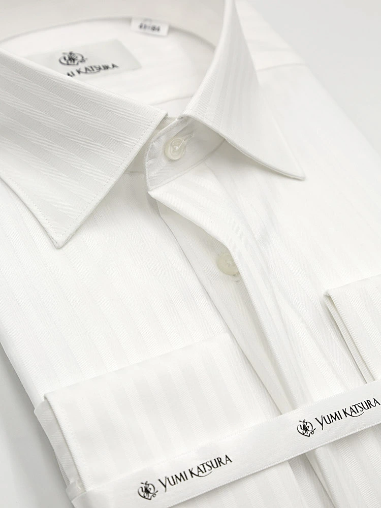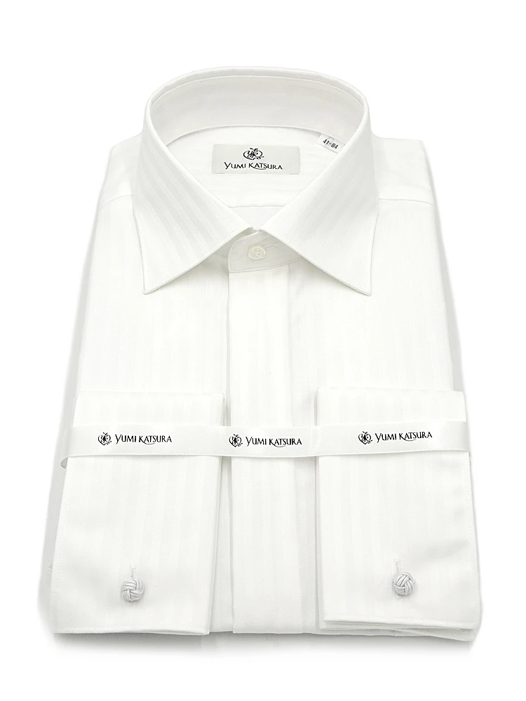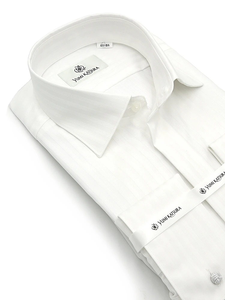 【綿100%】長袖 ドレスシャツ セミワイド 比翼前立 ダブルカフス仕様【セレモニー/パーティー】ホワイト ストライプ 通年 YUMI KATSURA