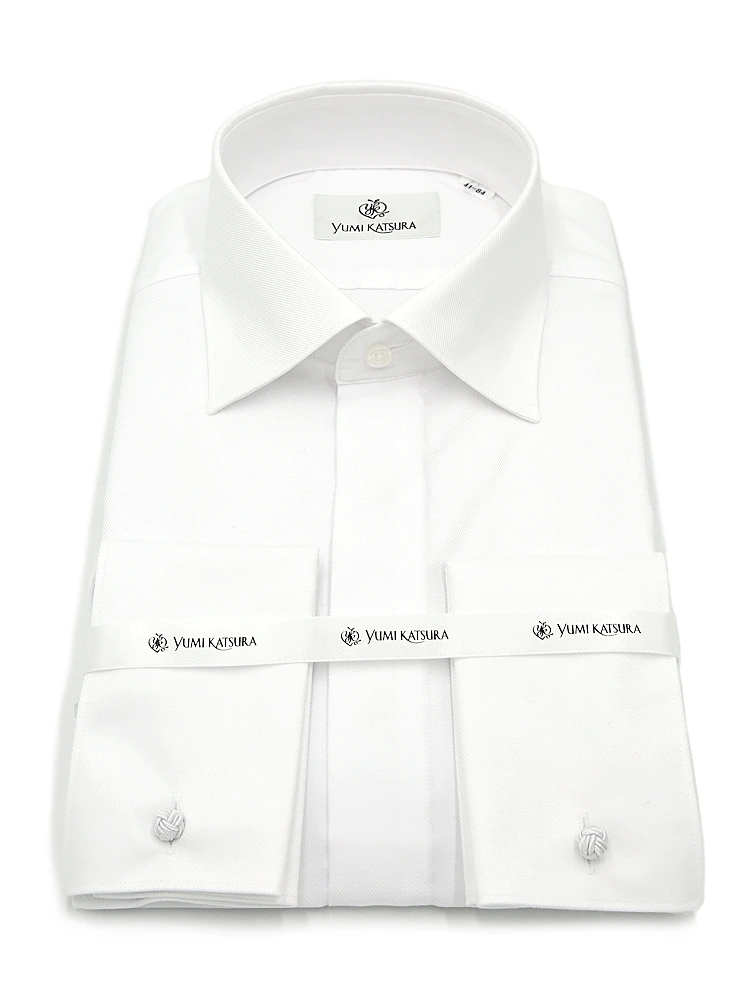 【綿100%】長袖ドレスシャツセミワイド比翼前立ダブルカフス仕様【セレモニー/パーティー】ホワイトツイル通年YUMIKATSURA