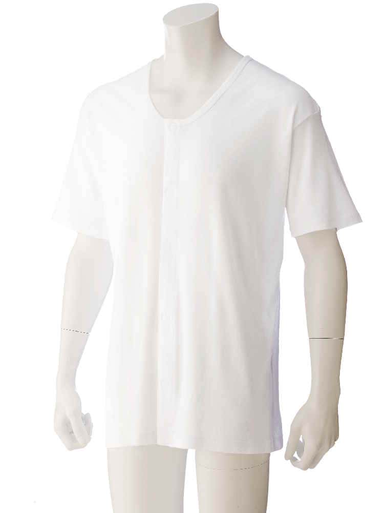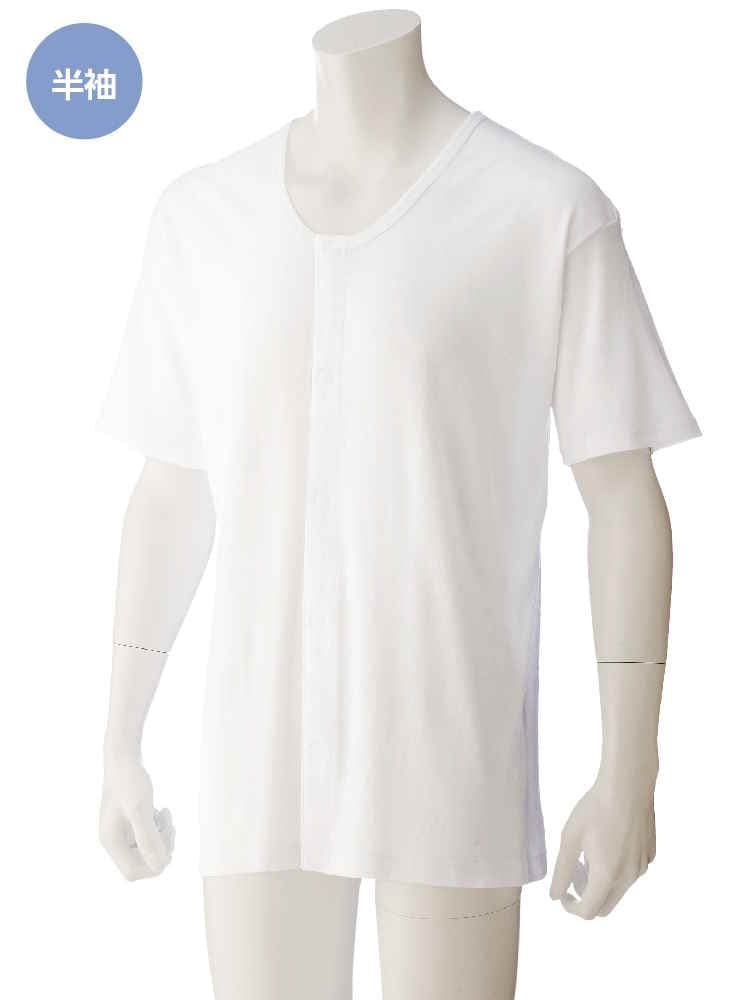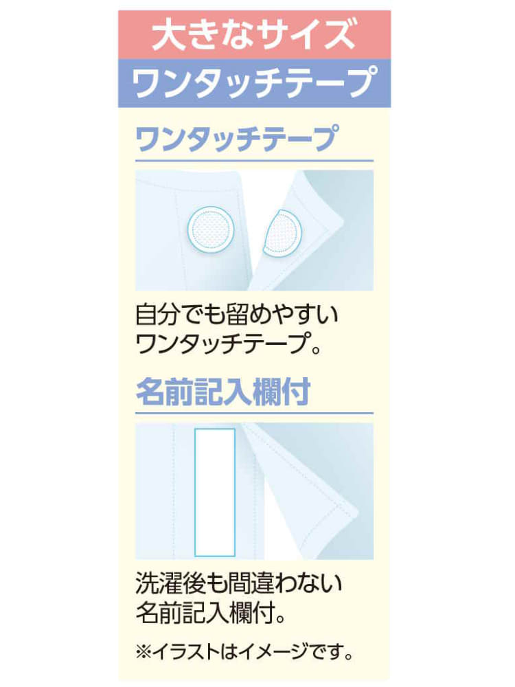 肌に優しい綿100%素材を使用。ボタンが留めにくい方でも楽にできるプラスチックホック。洗濯後間違わない名前記入欄付きです。