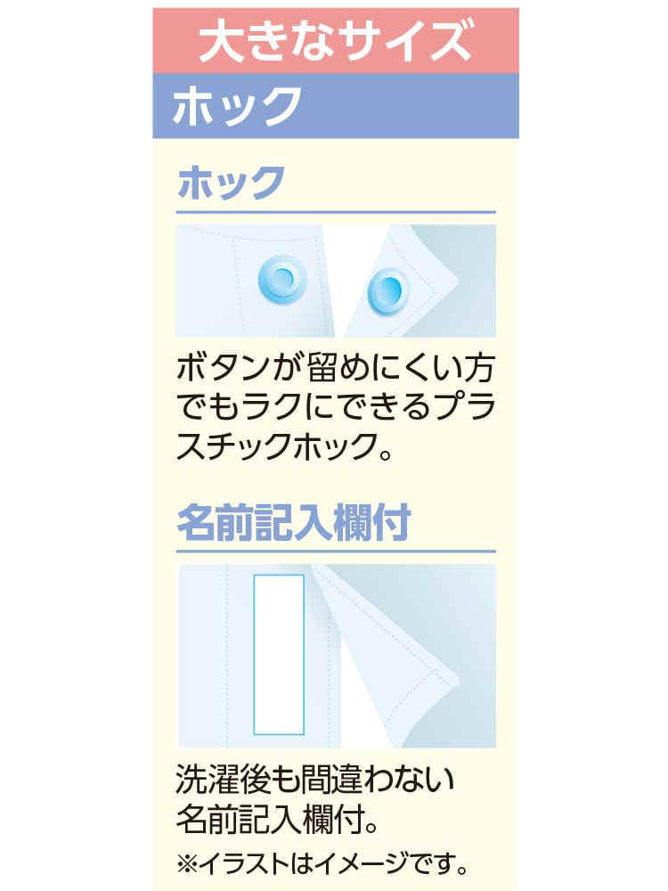 肌に優しい綿100%素材を使用。ボタンが留めにくい方でも楽にできるプラスチックホック。洗濯後間違わない名前記入欄付きです。