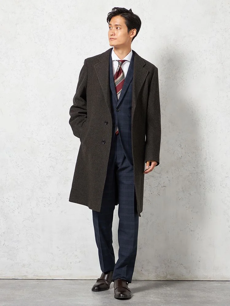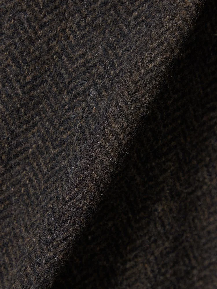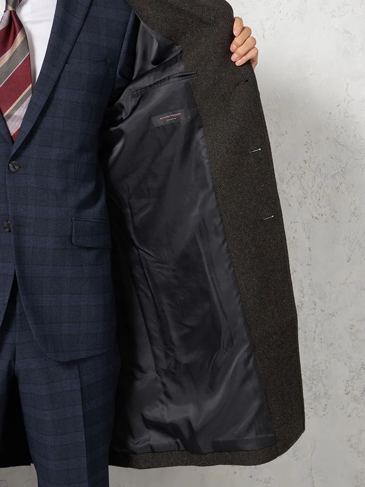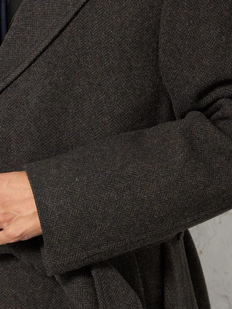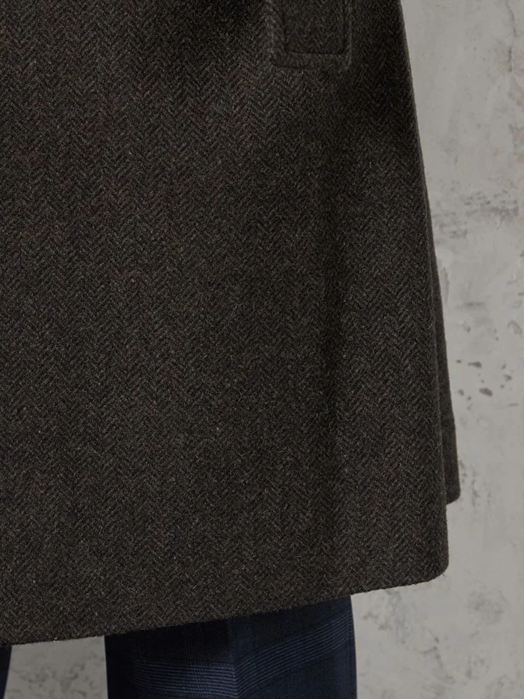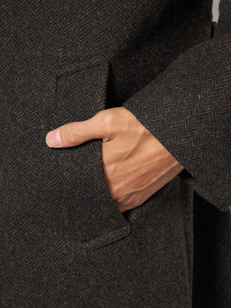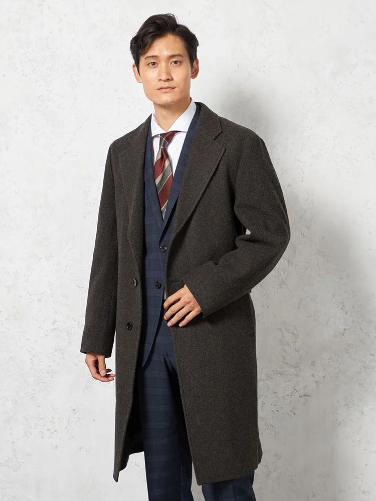 大人の落ち着きを感じさせるヘリンボーンツイード生地のウールコートです。