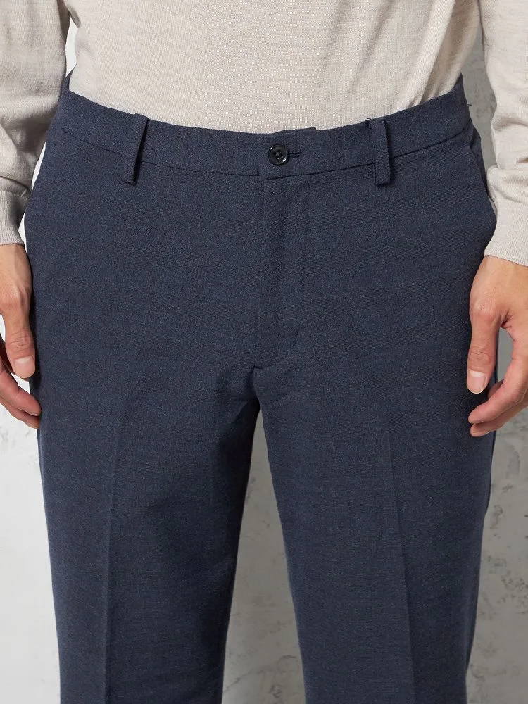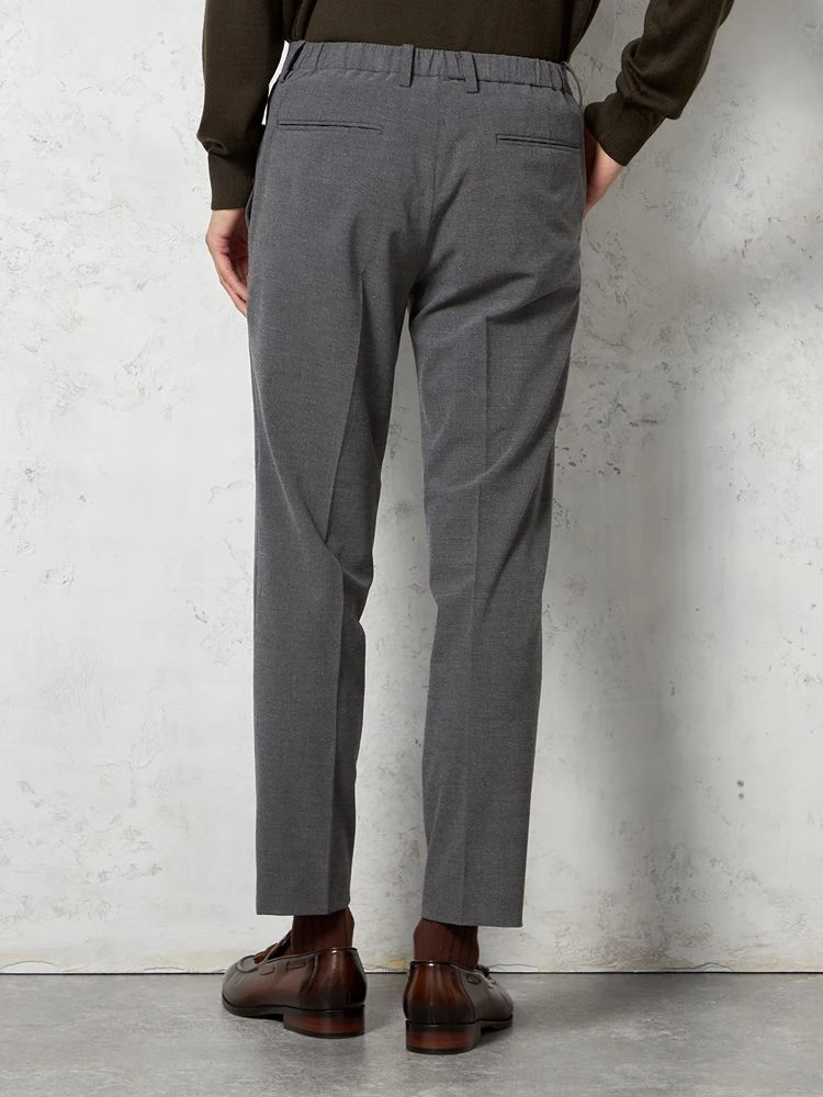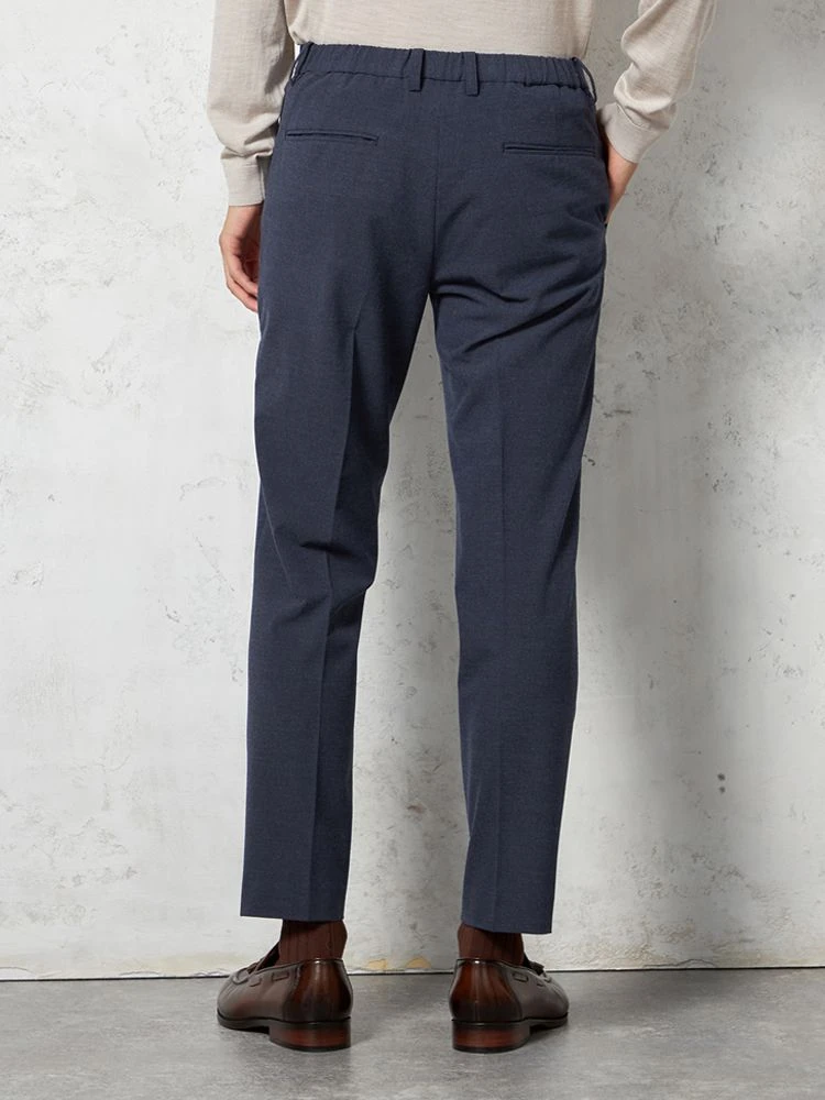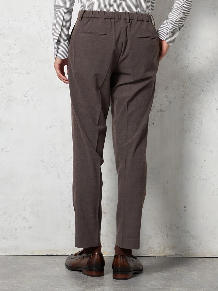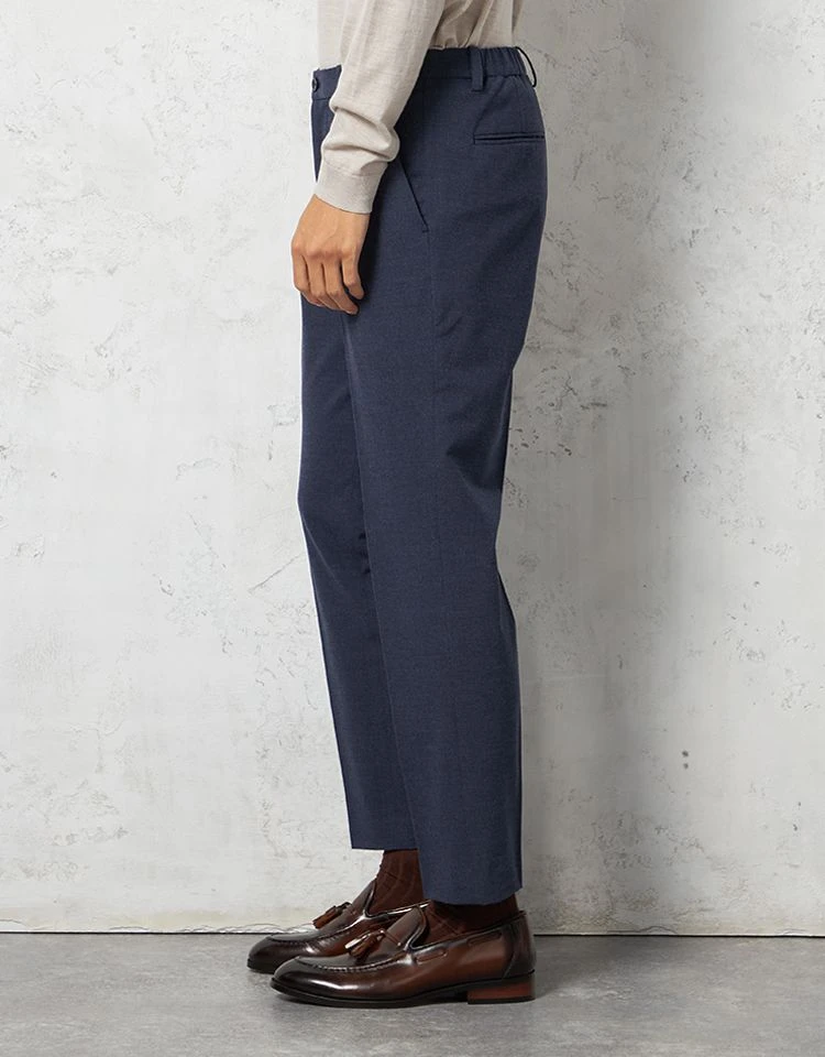 パンツの腰回りに生地の折り込みがなく、スッキリとしたシルエットを実現します。シンプルで洗練された印象を与え、すっきりとした着こなしが可能です。