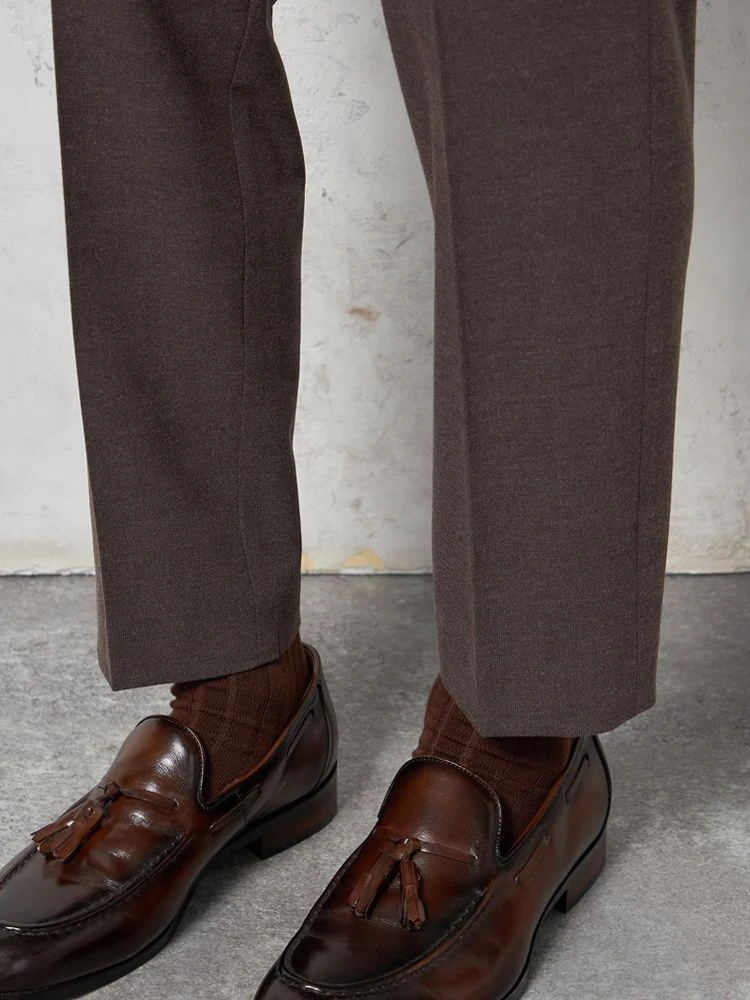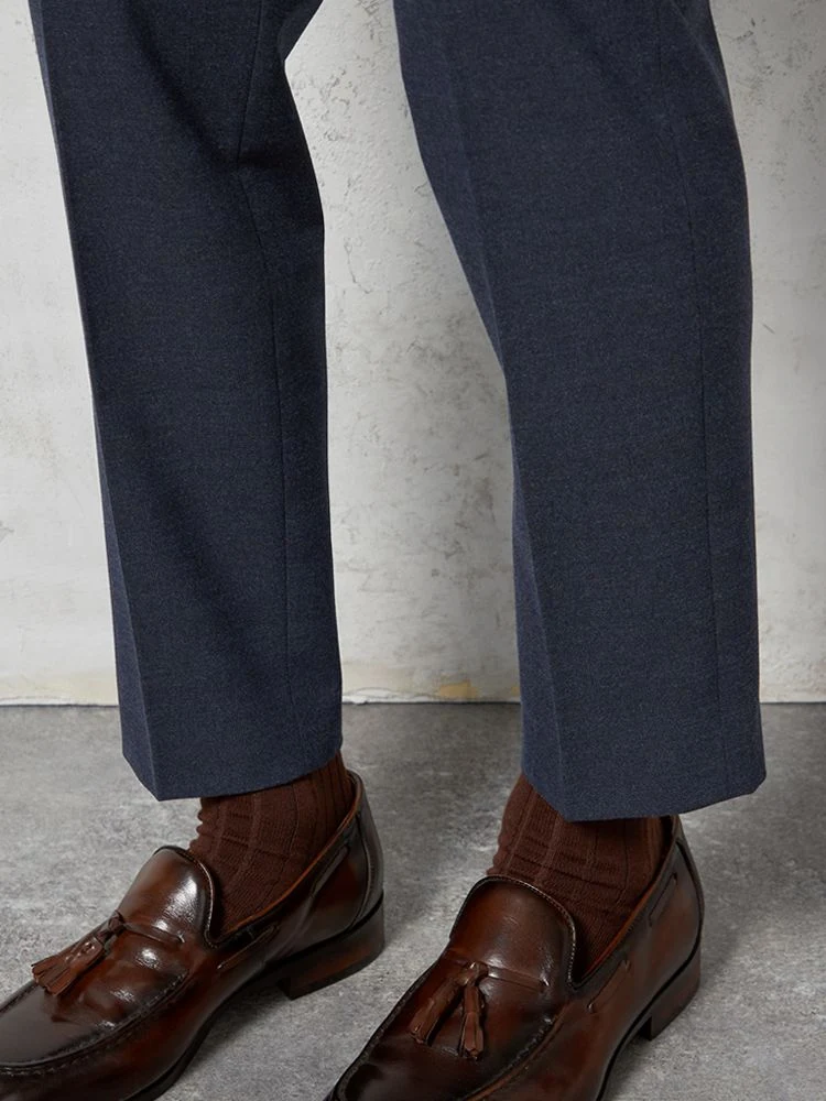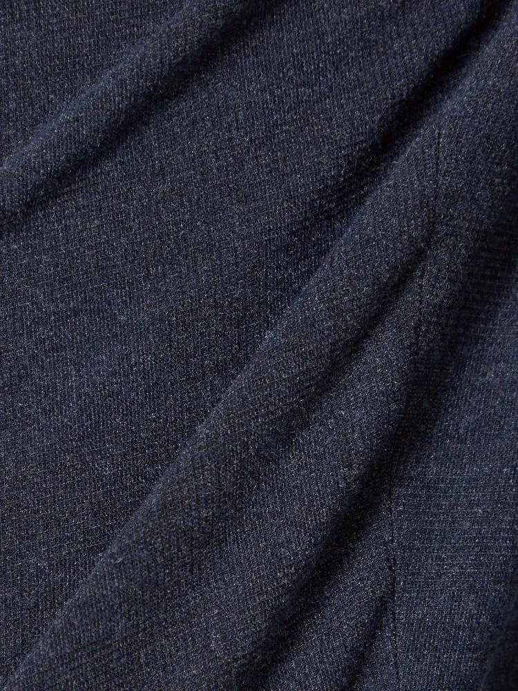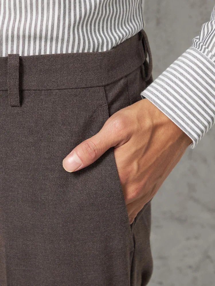 パンツの腰回りに生地の折り込みがなく、スッキリとしたシルエットを実現します。シンプルで洗練された印象を与え、すっきりとした着こなしが可能です。