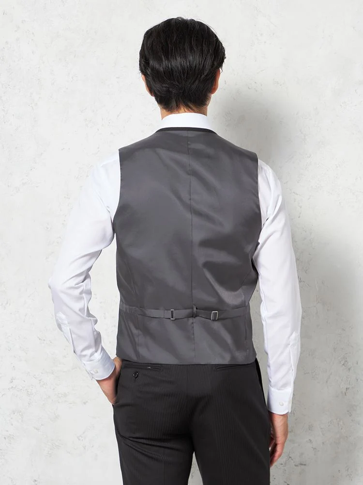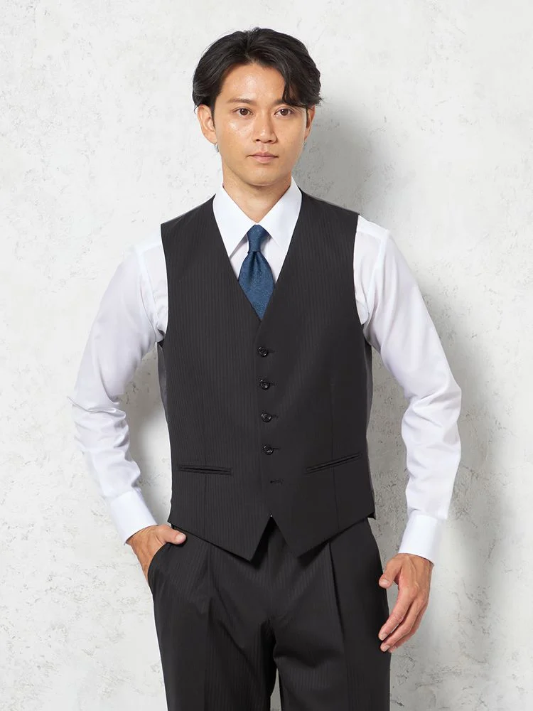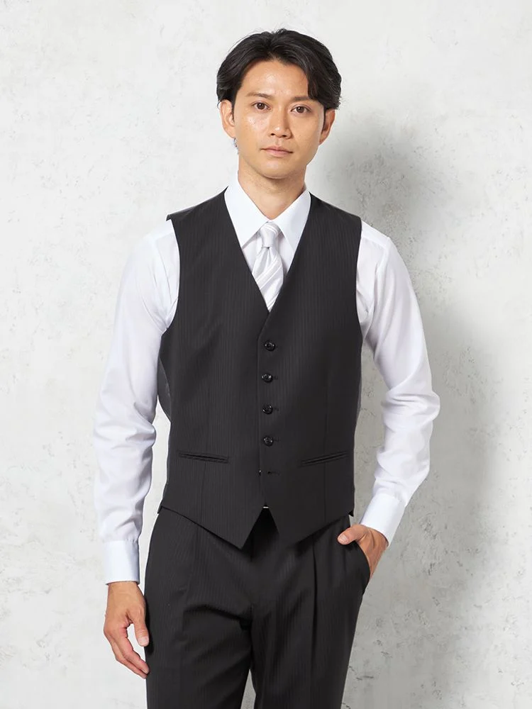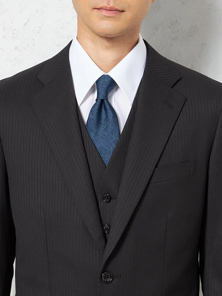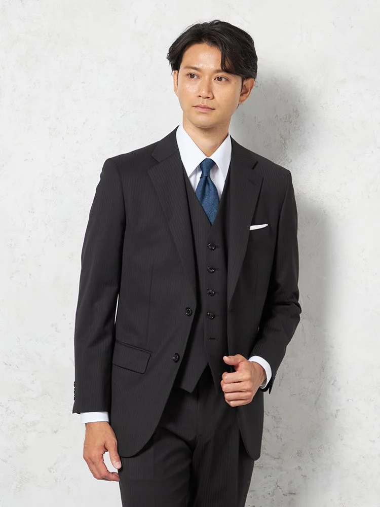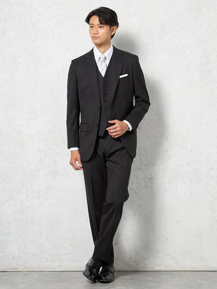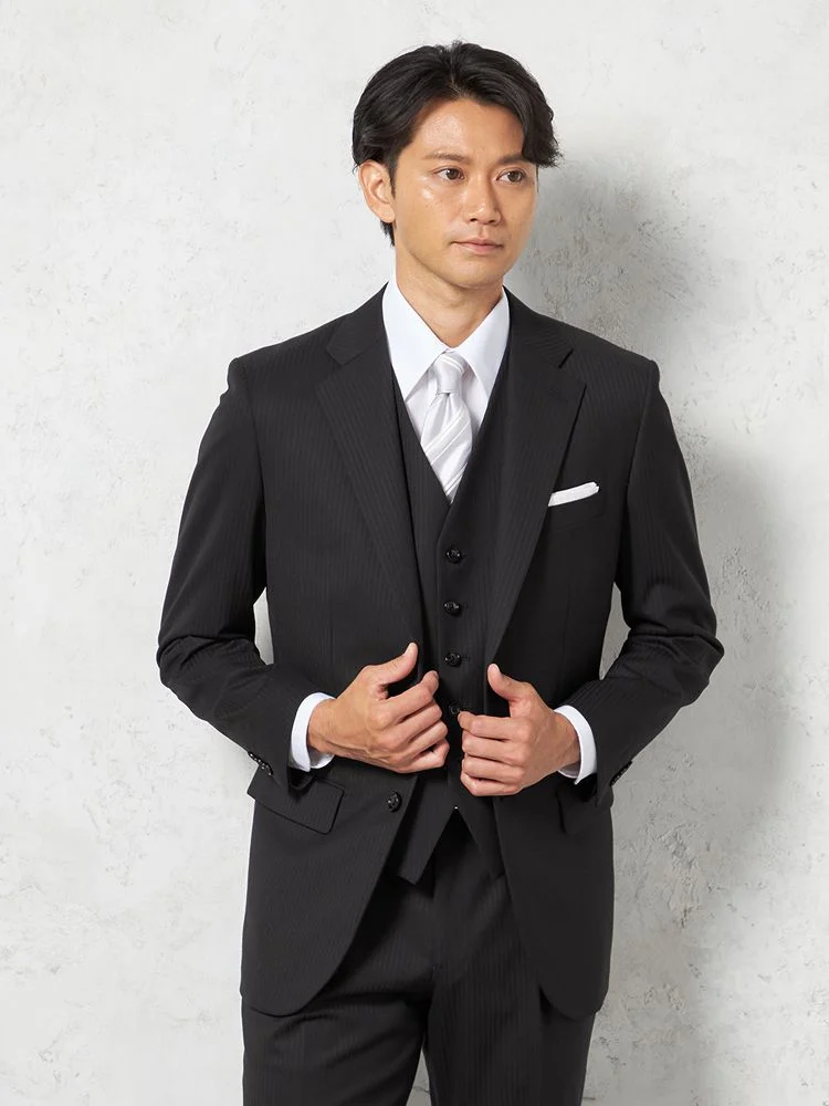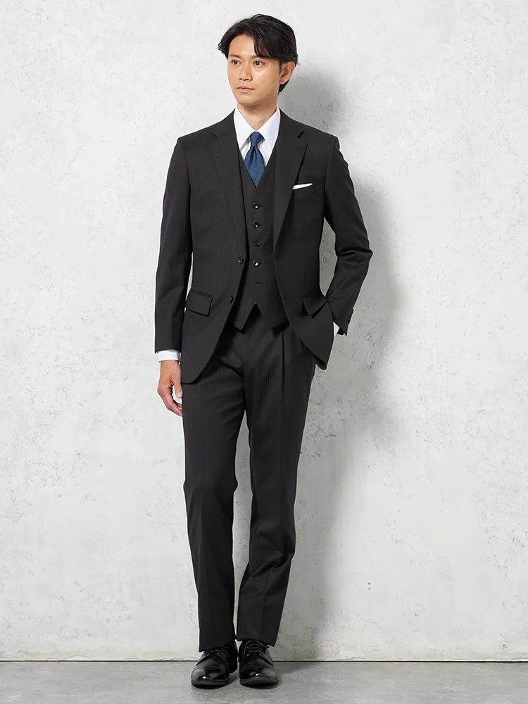 エレガントな表情のセレモニーシーンに好適な美光沢素材を使用したスリーピーススーツ。