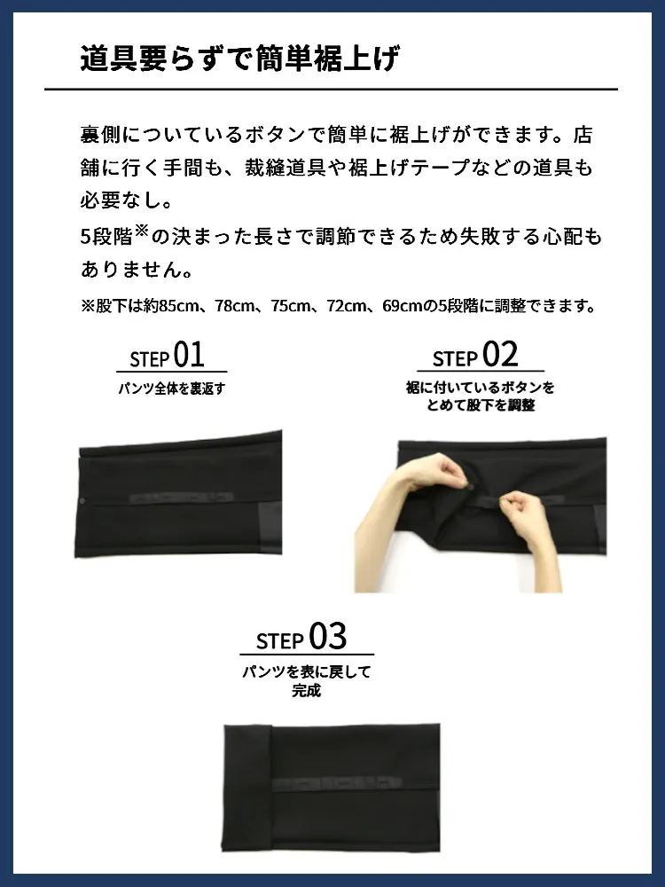 パンツ裾は内側のボタンを止めることで約85cm、78cm、75cm、72cm、69cmの5段階に股下調整可能。