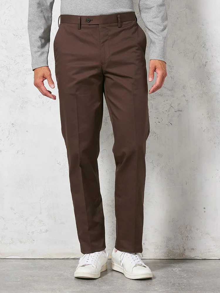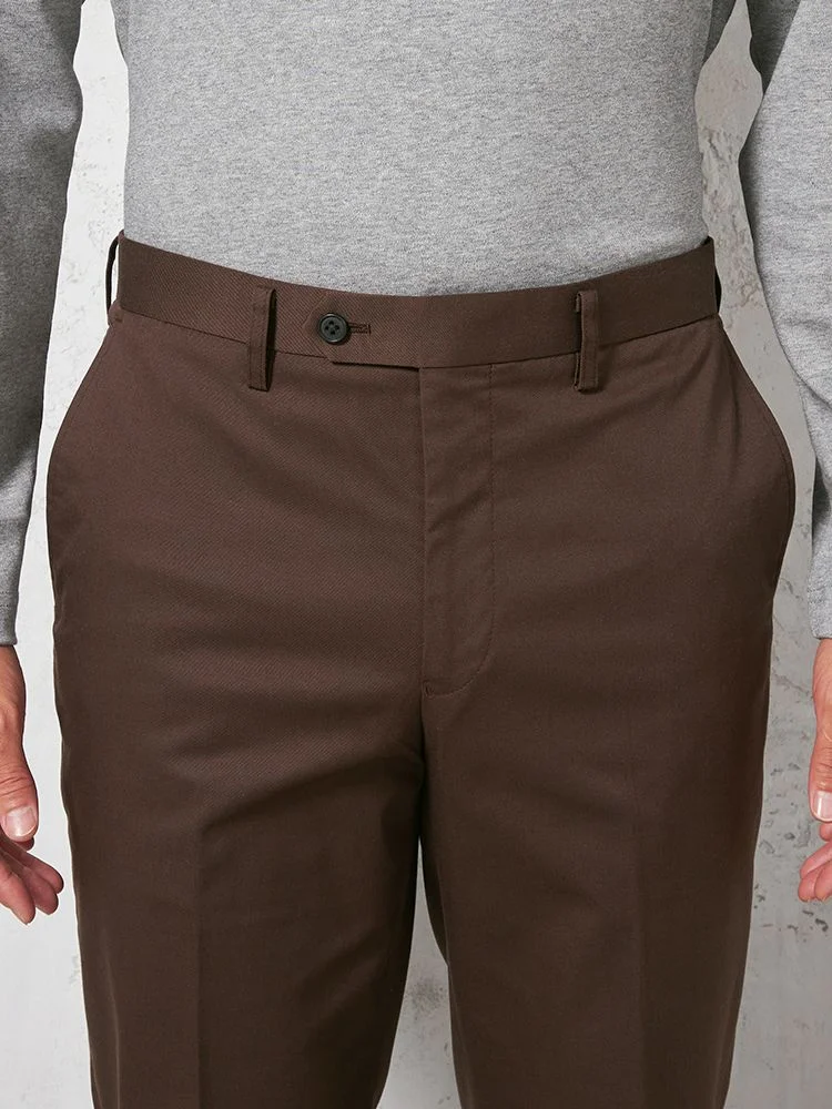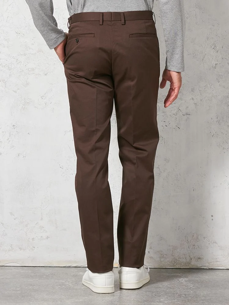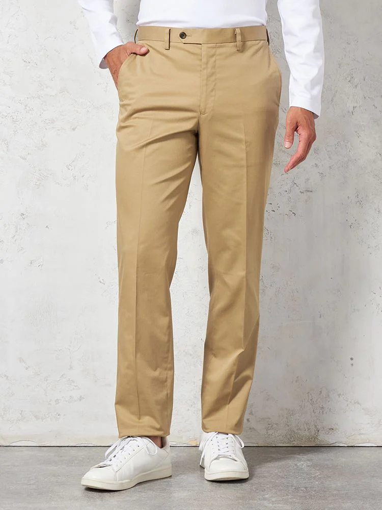 定番的に穿きこなせるノータックのチノパンツ。
