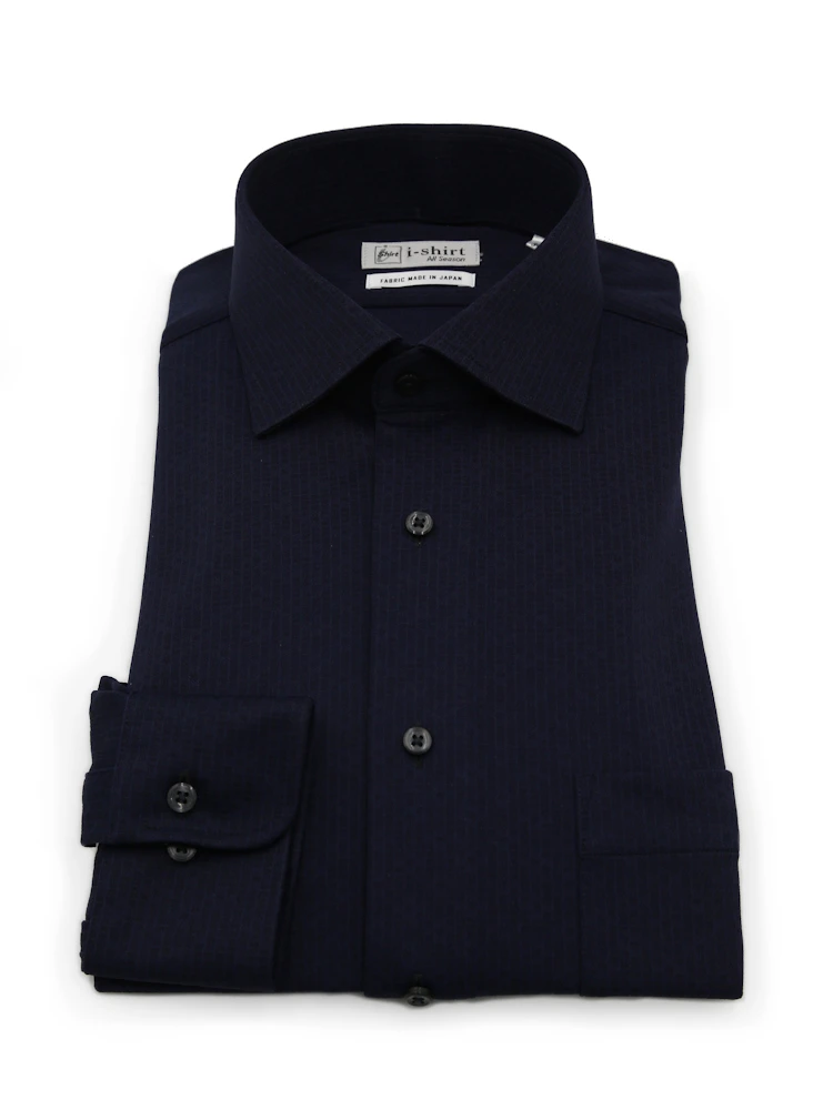 【完全ノーアイロン】長袖 アイシャツ セミワイド ストレッチ 防汚加工 織柄無地 ワイシャツ i-shirt 通年(ネイビー)