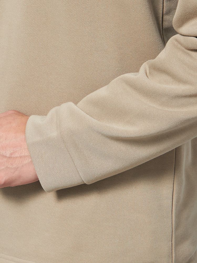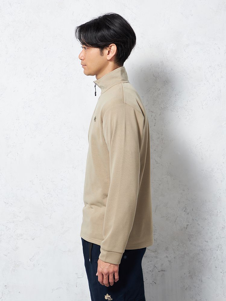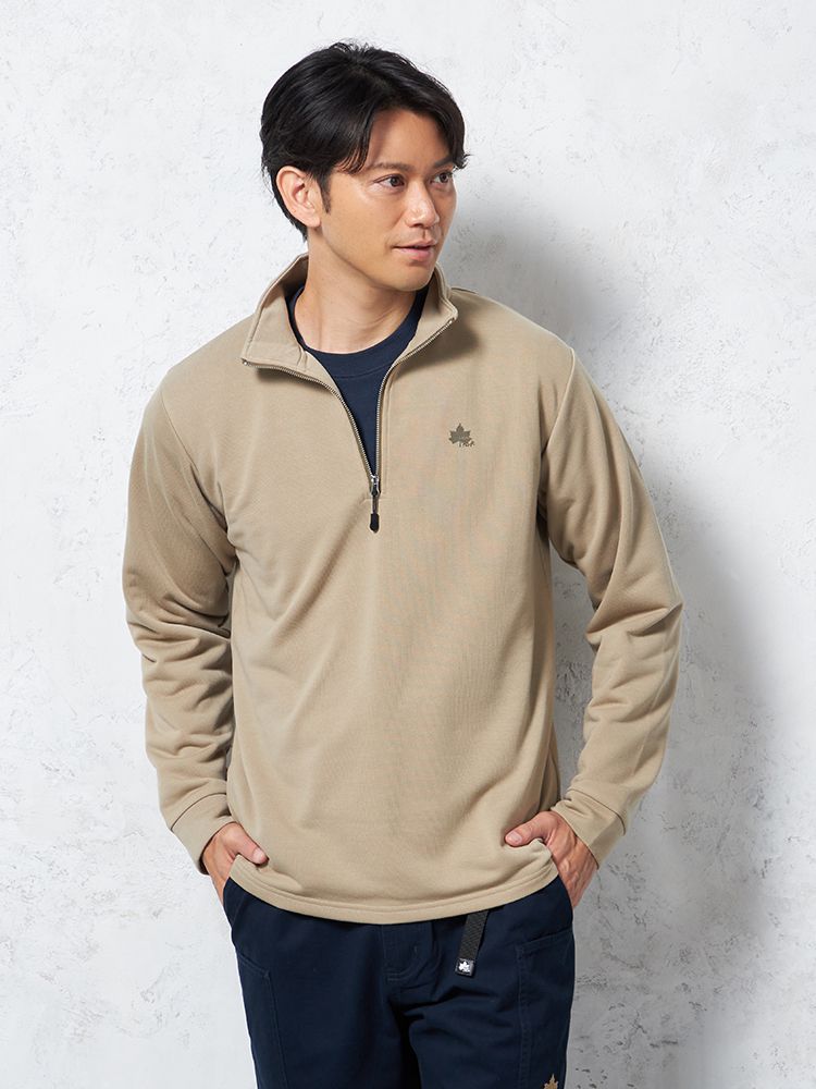 ジップの開き具合によって衿元のアレンジも楽しめるトレーナー。