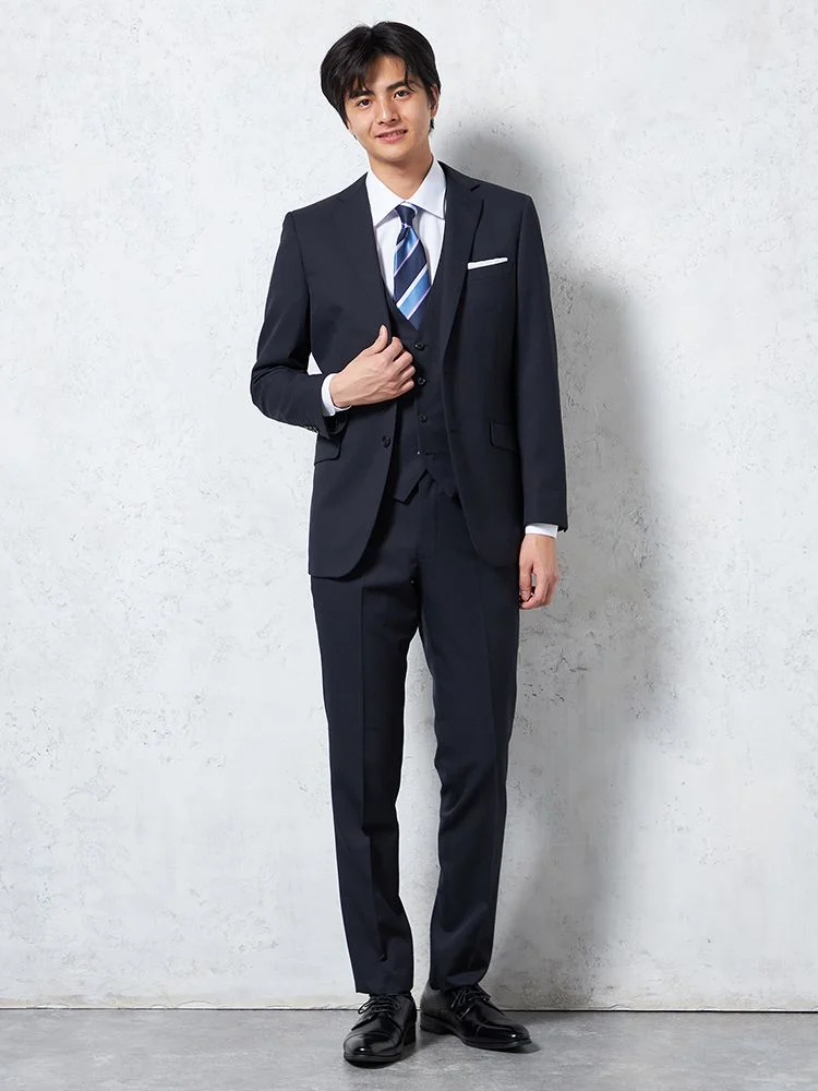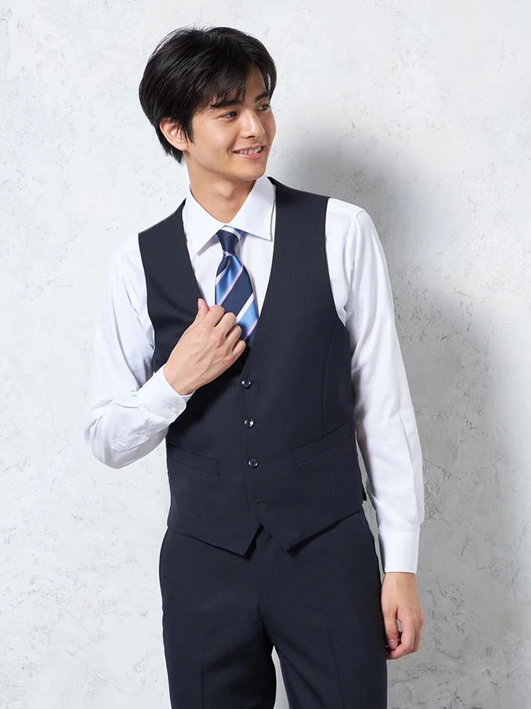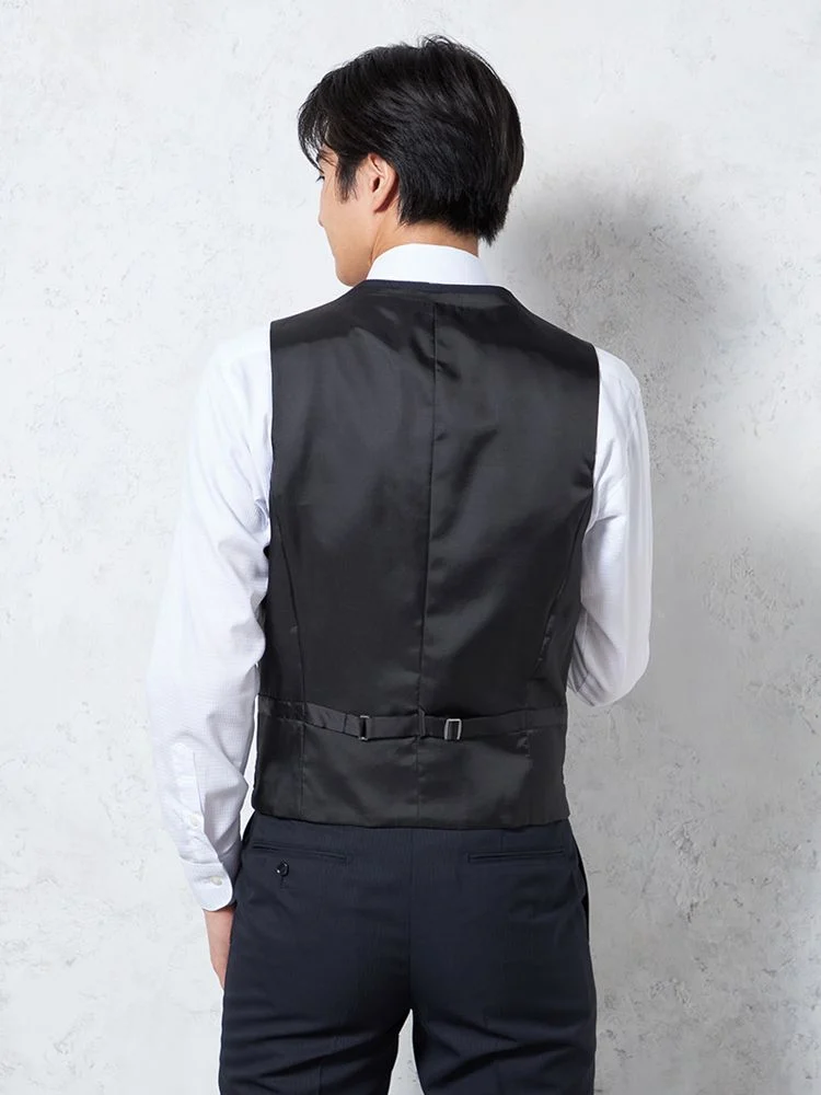 スマートにフォーマルな表情を演出できるベストつきスーツ。