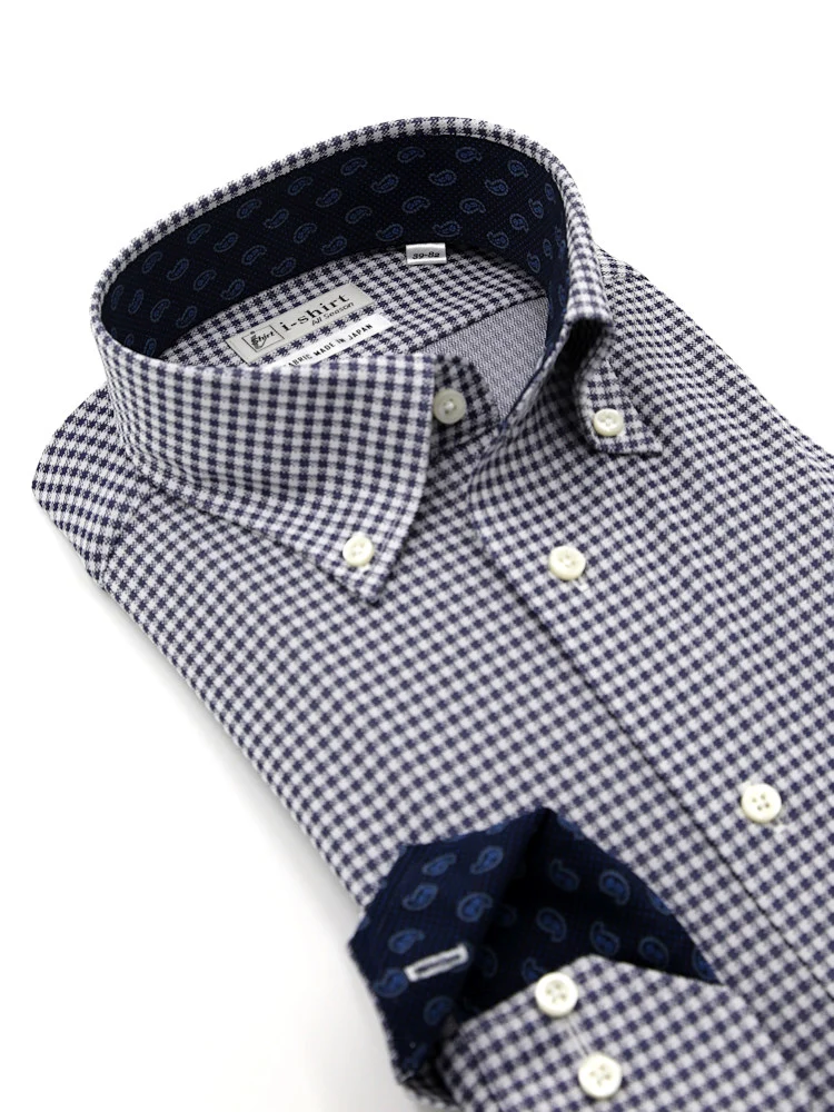 【完全ノーアイロン】長袖 アイシャツ ボタンダウン ストレッチ 吸汗速乾 ギンガムチェック ワイシャツ i-shirt 通年(ネイビー)
