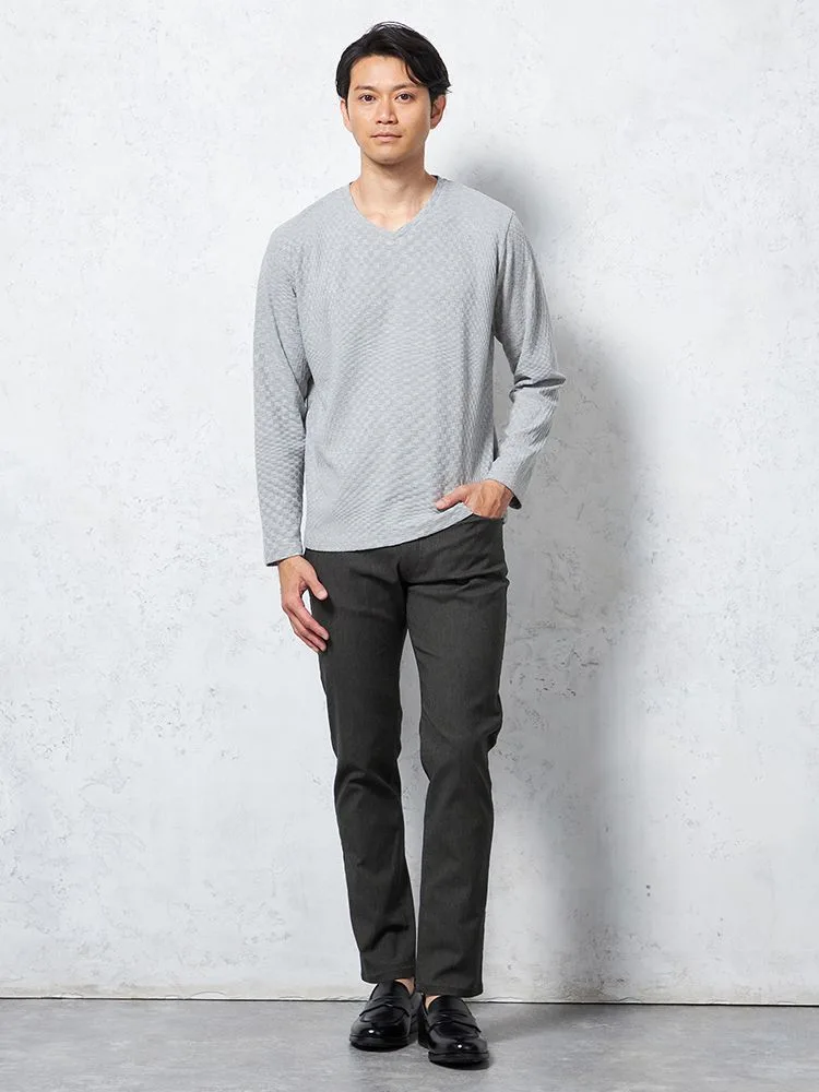 浅めのVネックは顔回りをすっきりと見せつつ上品な印象。