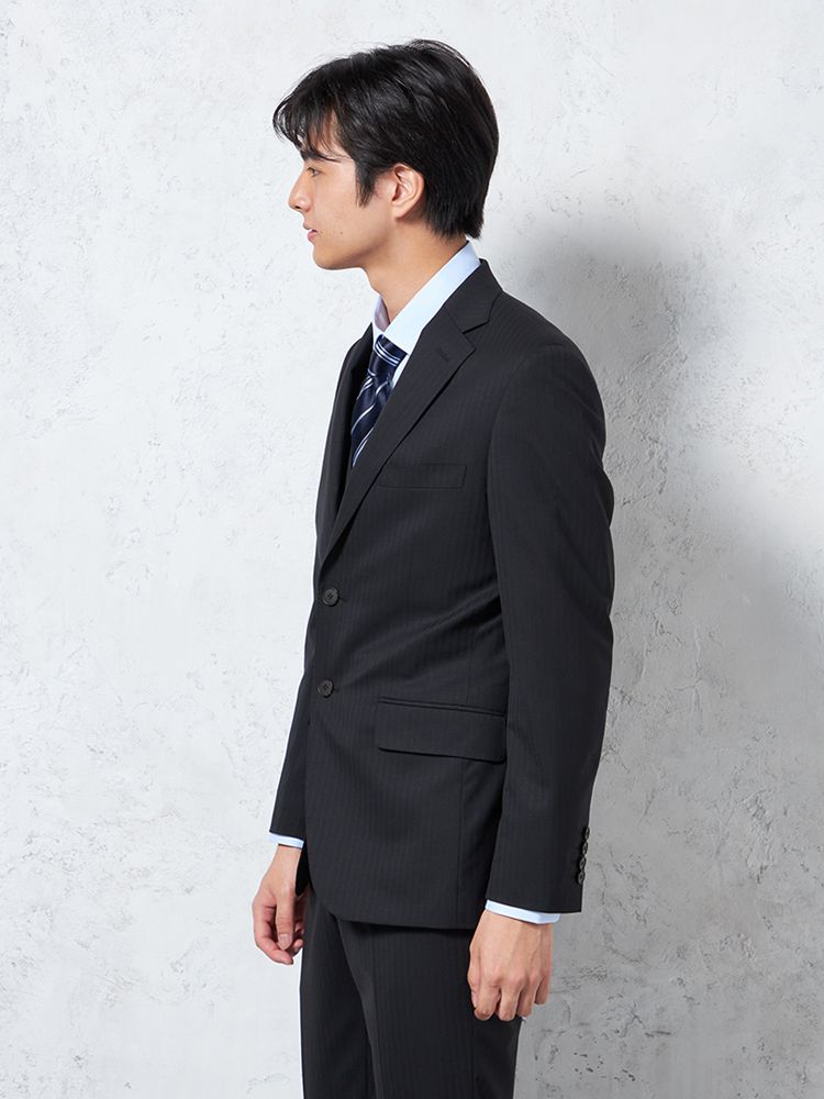 シャドーストライプのデザインやスリムシルエットがスタイリッシュな印象です。
