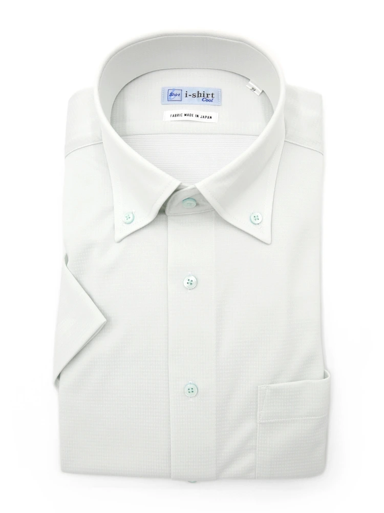 【完全ノーアイロン】半袖 アイシャツ ボタンダウン【バイオセンサークール生地使用】吸湿冷感 高通気 ミニブロック ワイシャツ i-shirt 春夏(L.グリーン)