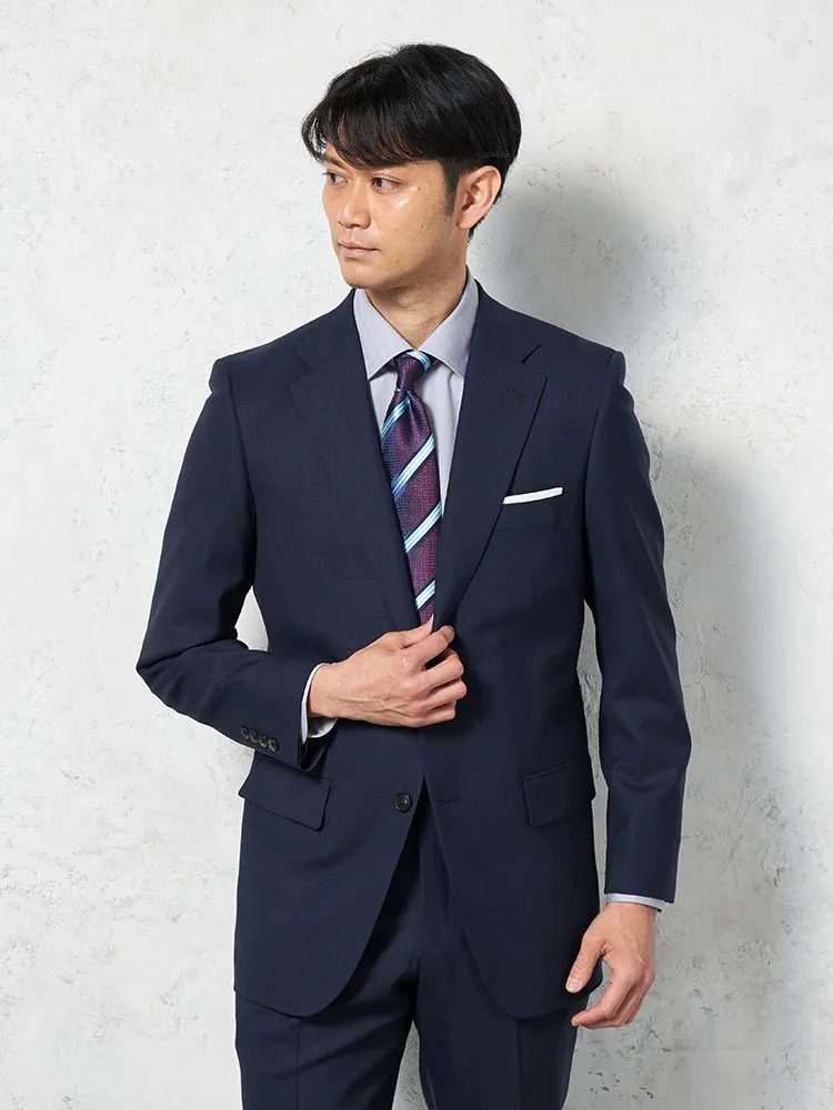 ウールを織り交ぜた、上質な尾州の生地を用いたスーツです。