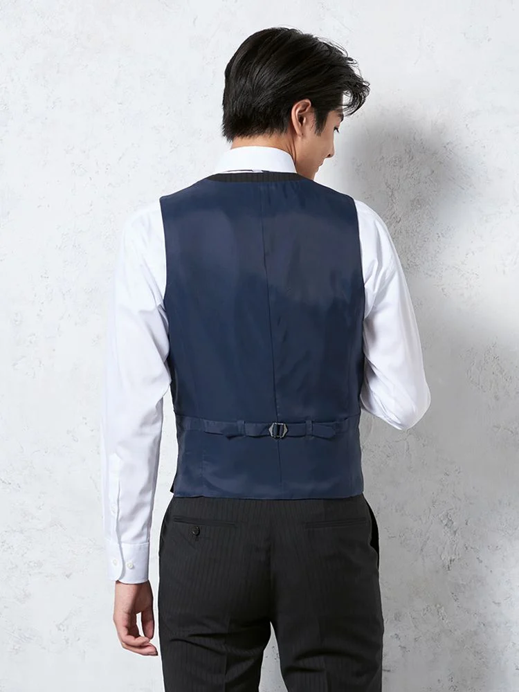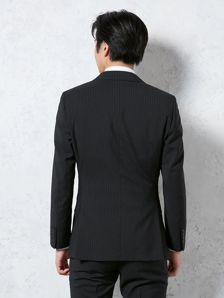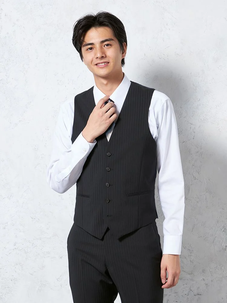 洗練されたな着こなしに仕上がるブラック×ストライプのスリーピーススーツ。
