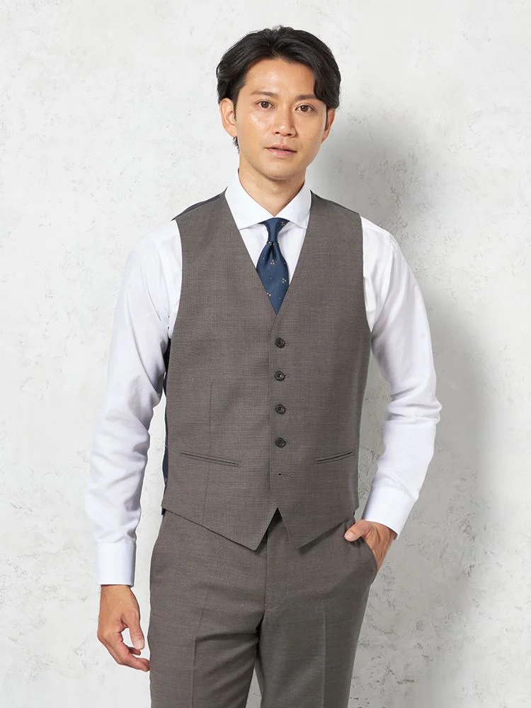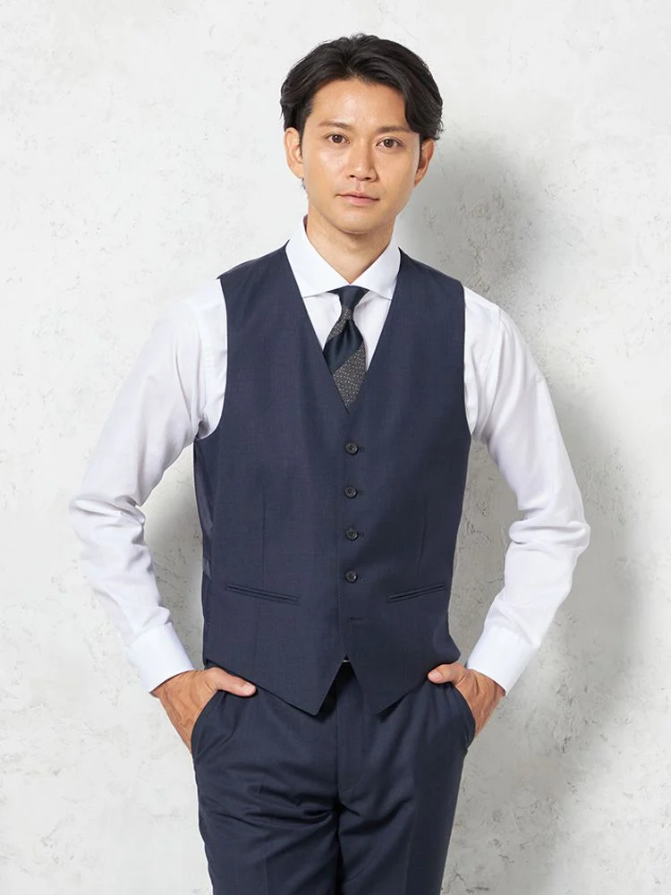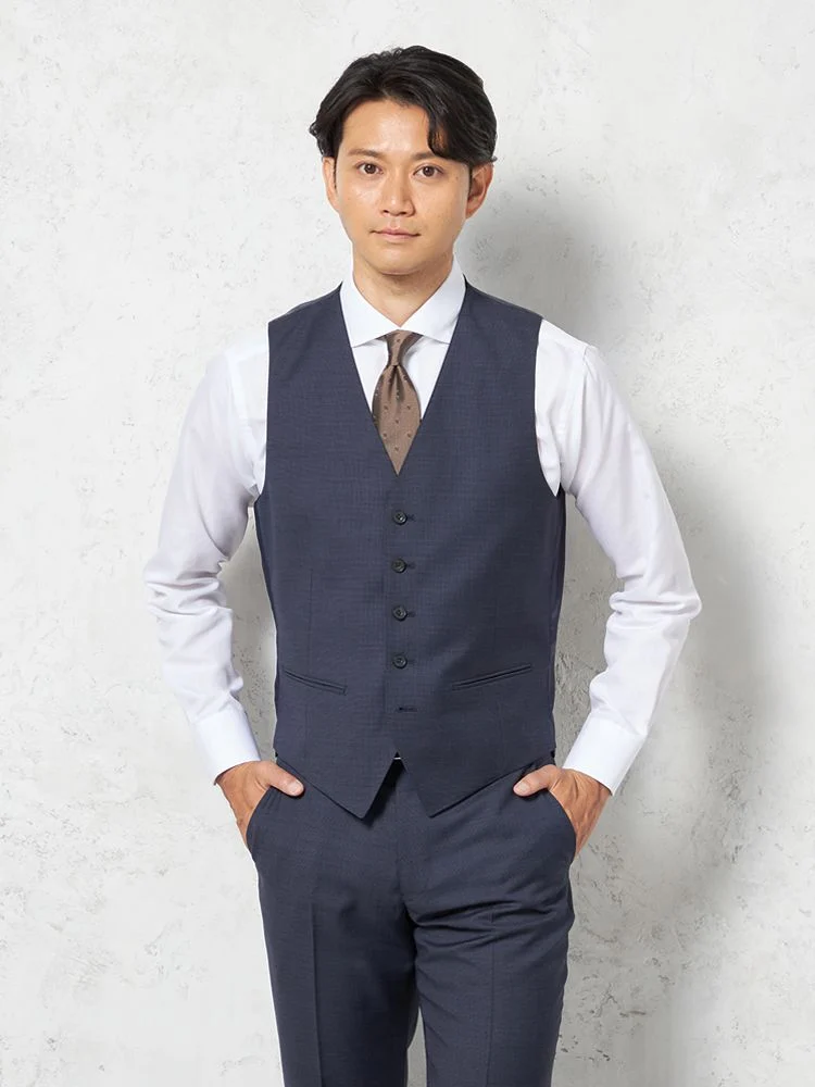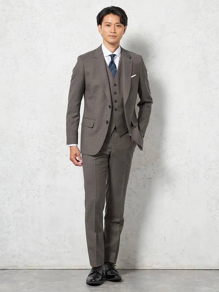 ジャケット、パンツ、ベストの3点セットで、スーツ全体を簡単にコーディネートできます。ビジネスやフォーマルな場面に最適です。