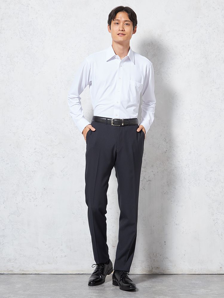 パンツの腰回りに生地の折り込みがなく、スッキリとしたシルエットを実現します。シンプルで洗練された印象を与え、すっきりとした着こなしが可能です。