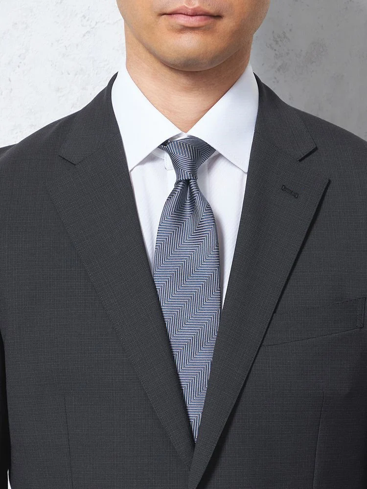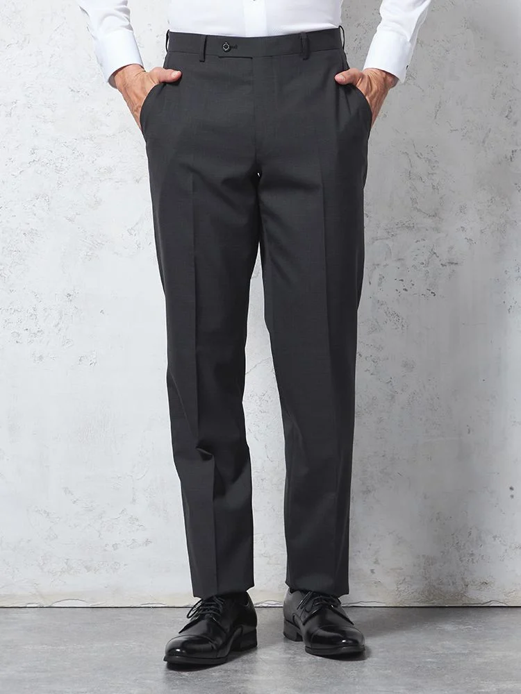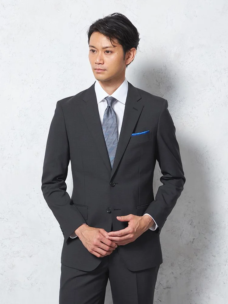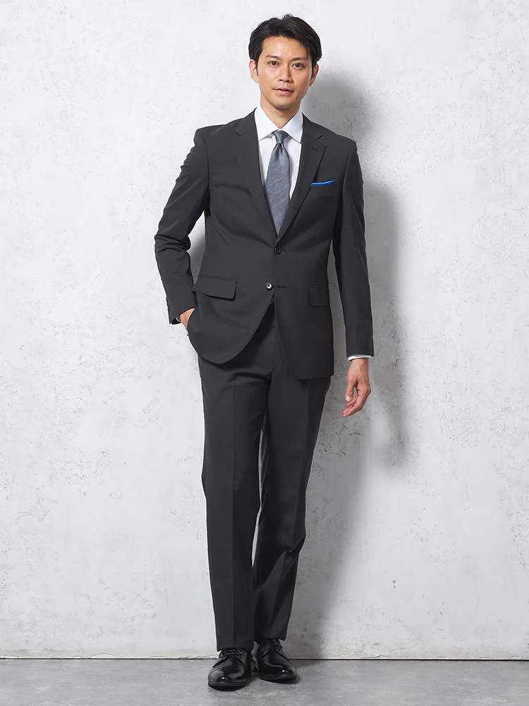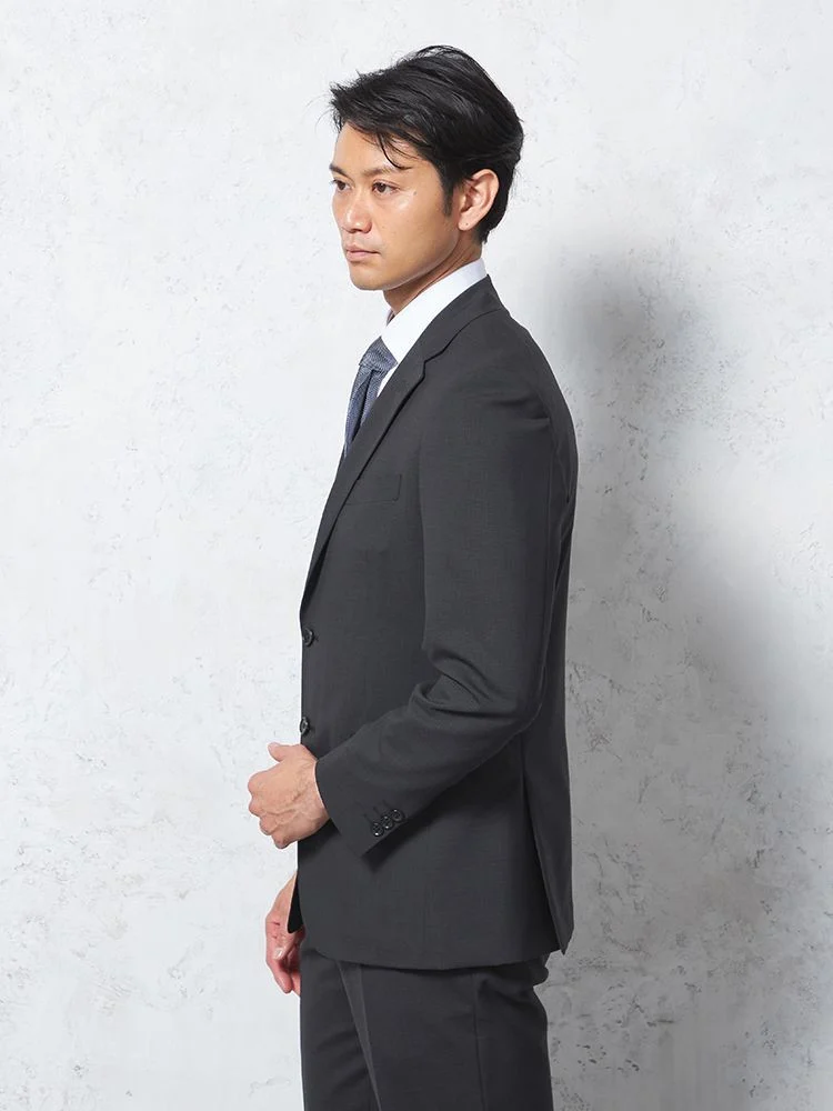 ジャケットはエレガントで動きやすいサイドベンツ仕様、パンツはすっきり見えるノータック仕上げ。