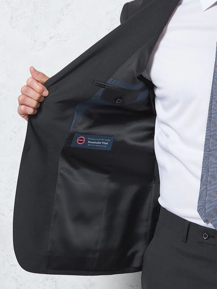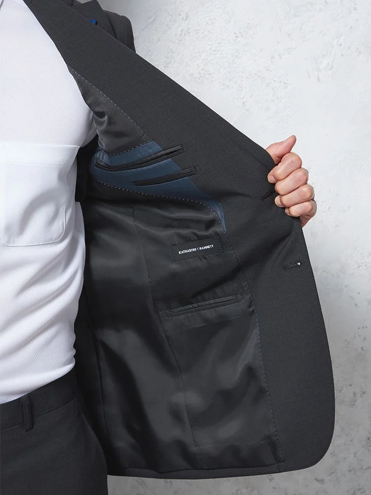 サスティナブルウール素材を使用した【KATHARINE E HAMNETT-キャサリン・イー・ハムネット-】のグレーツーピーススーツ。