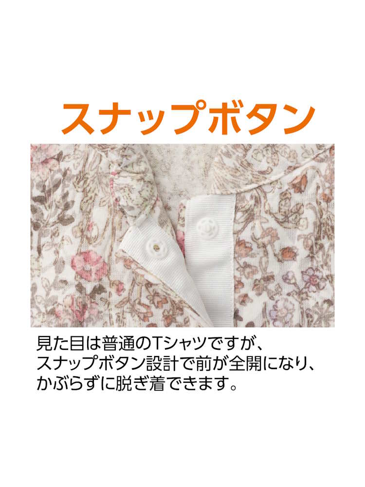 見た目は普通のTシャツですが、スナップボタン設計で前が全開になり、かぶらずに脱ぎ着できます。