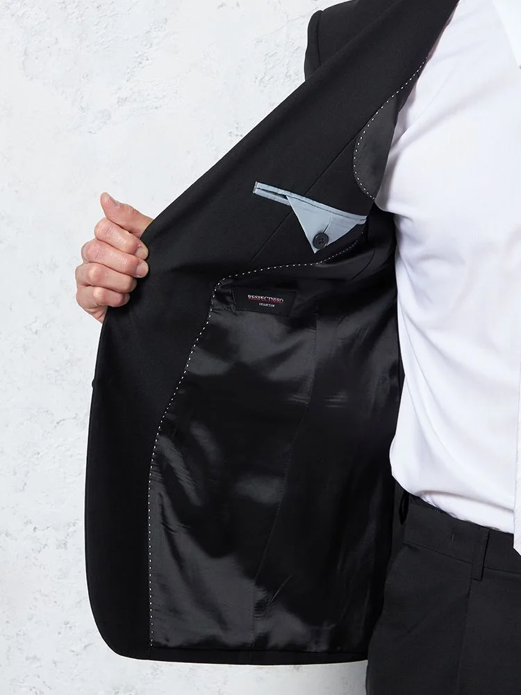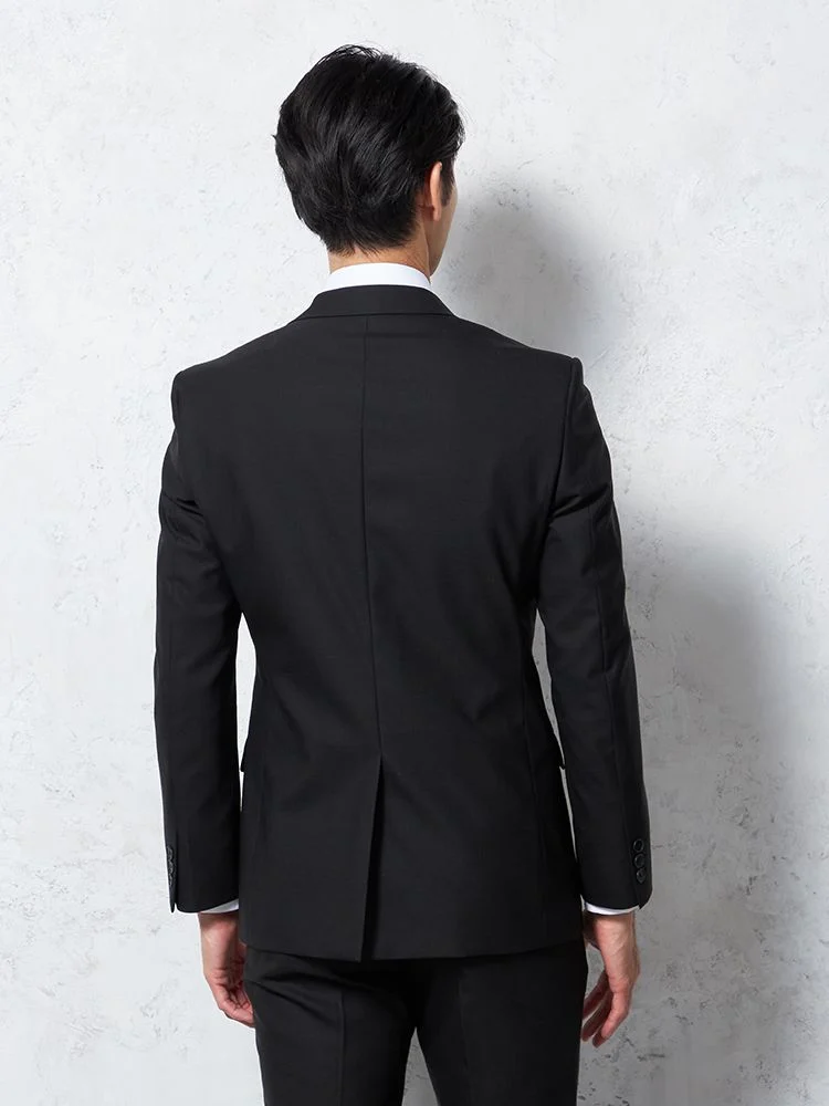 冠婚葬祭で年代問わず使えるベーシックなブラックフォーマルスーツ。