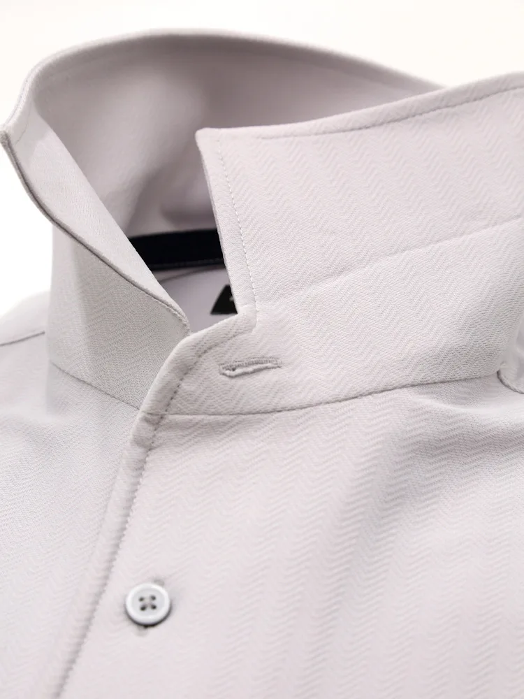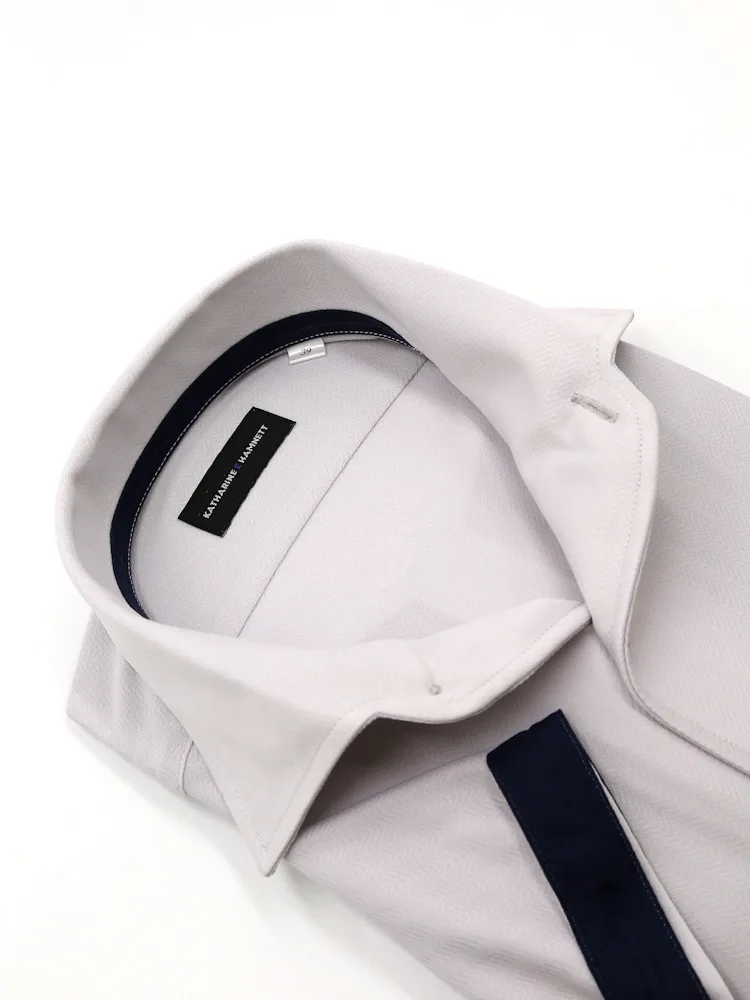人気のエコアイシャツ生地を使用。衿型はノーネクタイで衿開きの美しいワンピースカラー仕立て。衿から前立て部分まで一枚生地仕立ての衿台のない衿開きがきれいなロールになる仕様で、ネクタイをする場面でも格好良く着用出来ます。