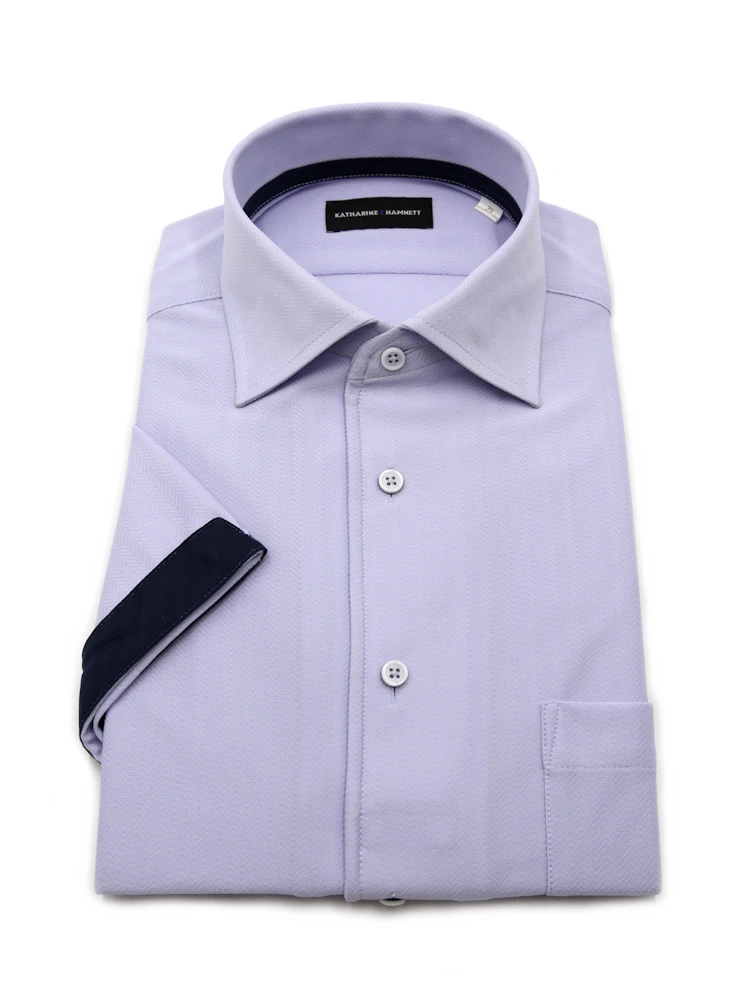 【KATHARINE E HAMNETT-キャサリン・イー・ハムネット-】半袖 ワイシャツ ワンピースカラー セミワイド 360°ストレッチ 吸水速乾 へリンボン 通年(ブルー)